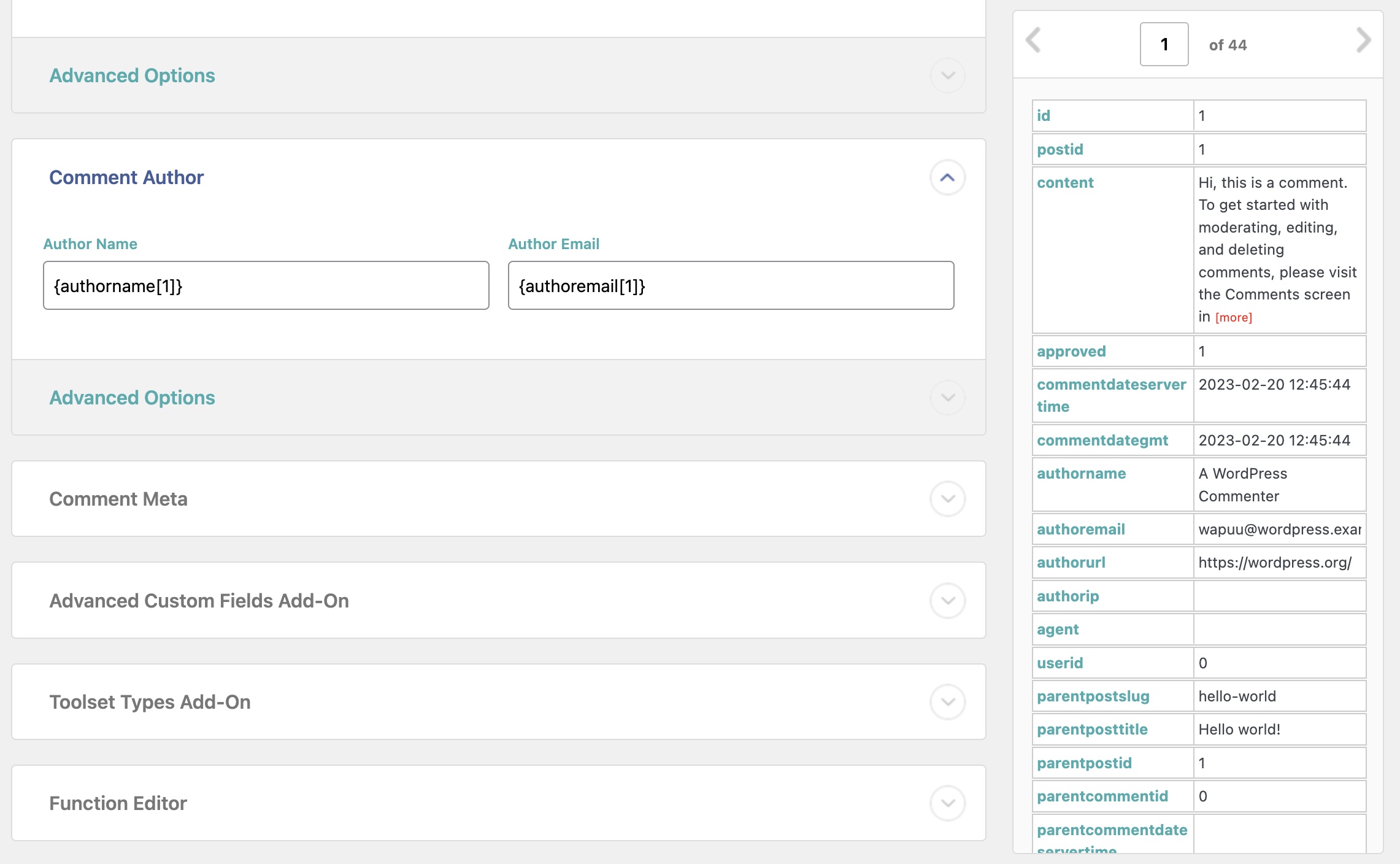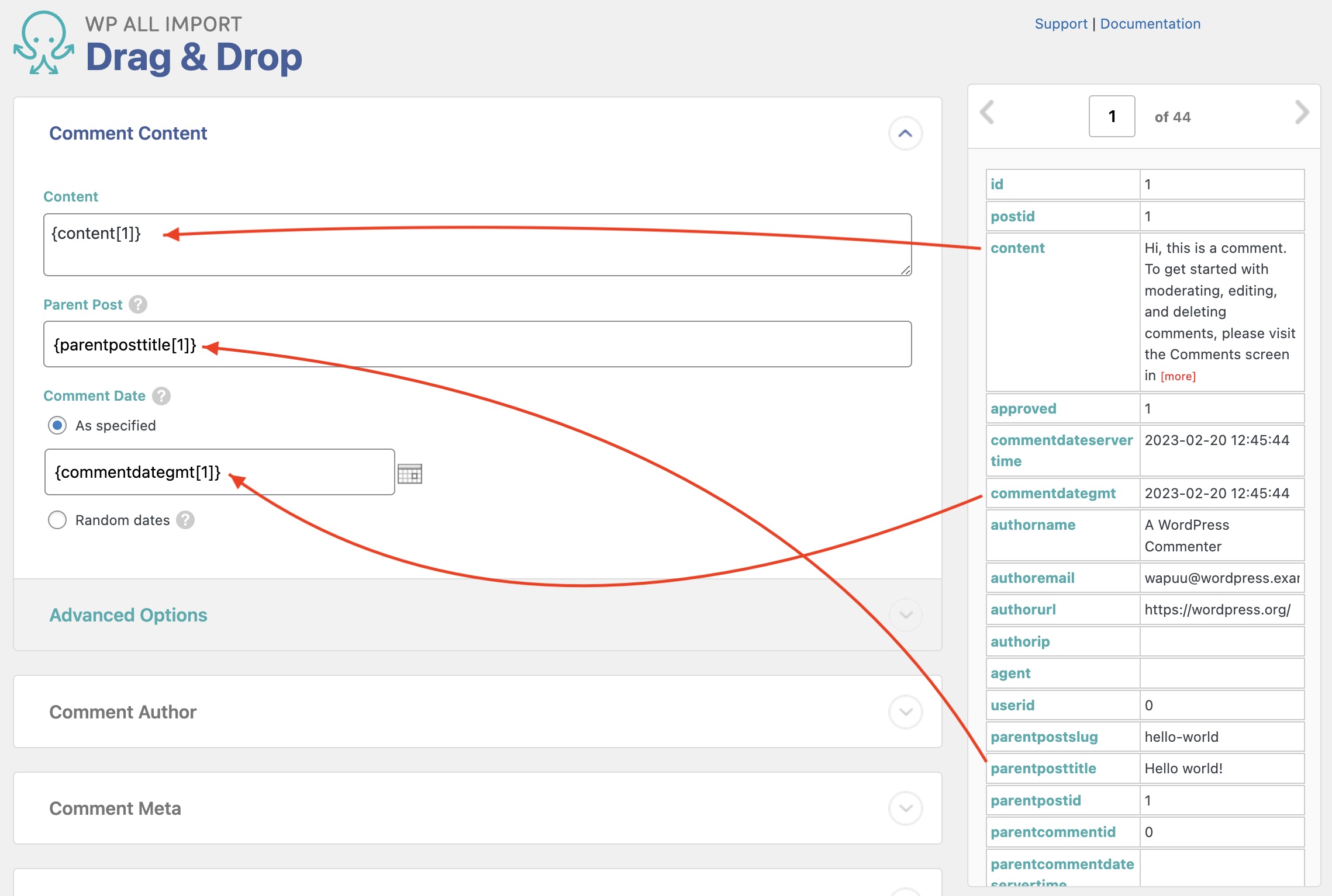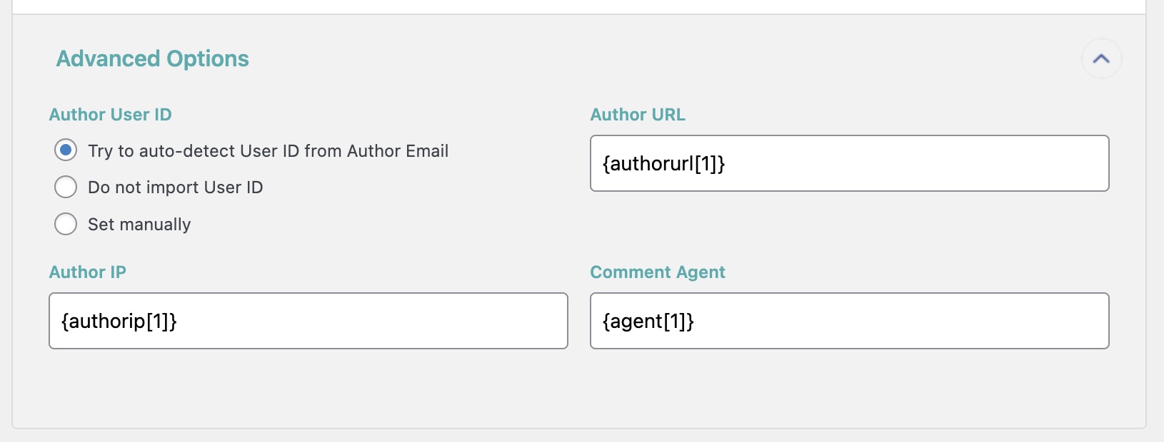There are additional advanced options in this section that let you map the Author User ID, Author IP, Author URL, and Comment Agent: