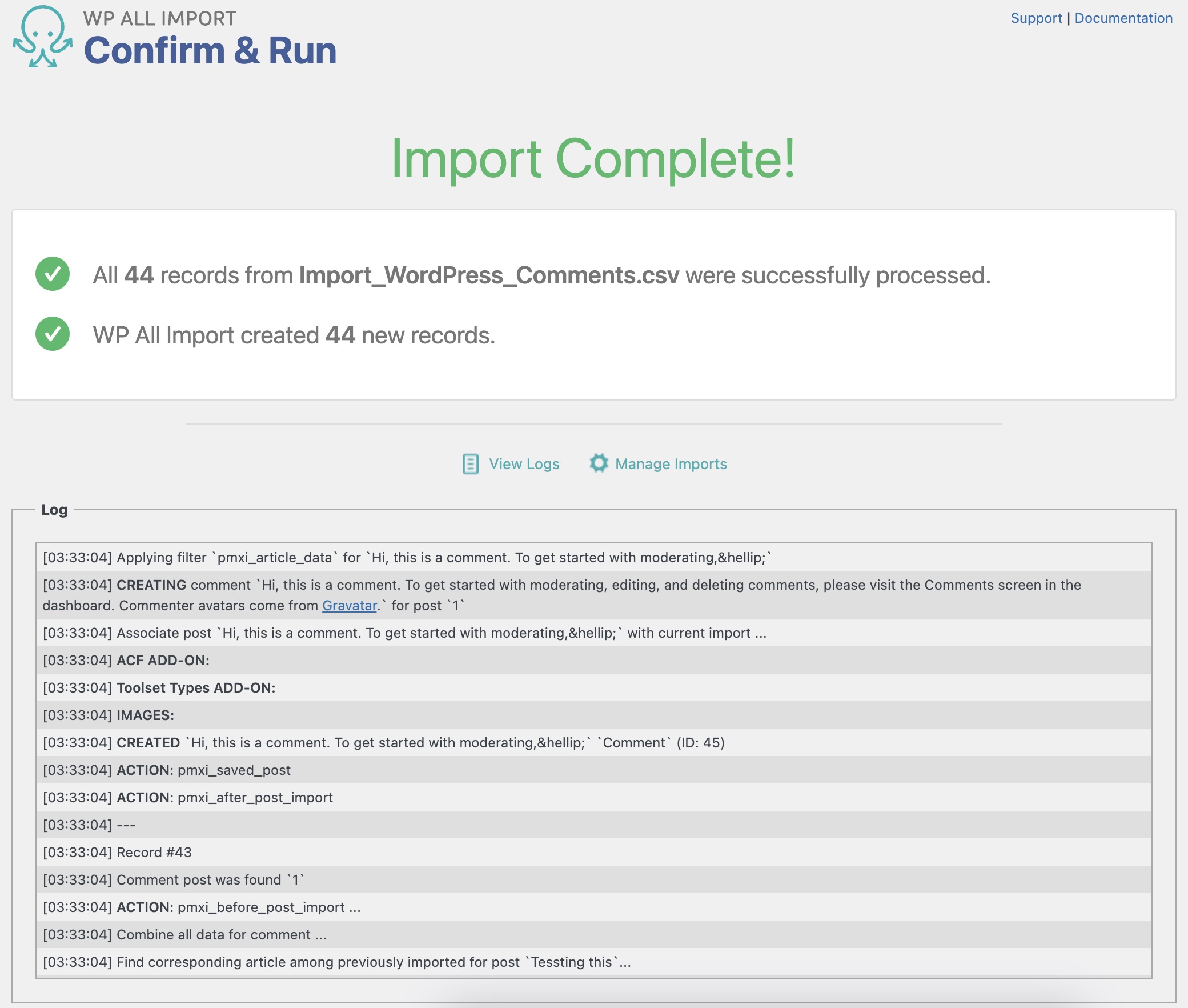 To import WordPress comments, go to All Import › New Import, provide your import file, and map the incoming data elements to the relevant WordPress comment fields. Run the import, then verify that the new data is correct.
