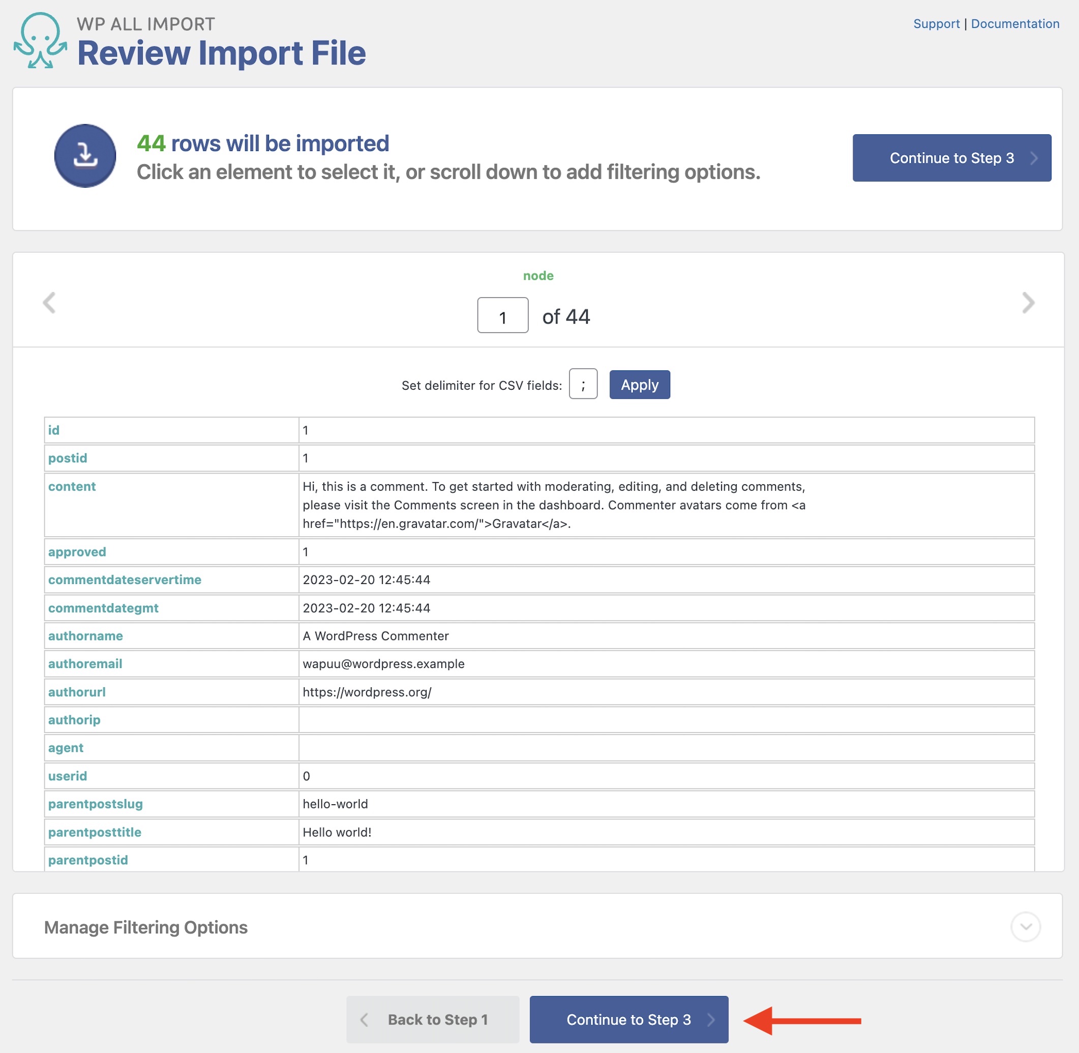 Near the bottom, you can use the Manage Filtering Options section to apply filters to the import data, which you to narrow down which comments to import.