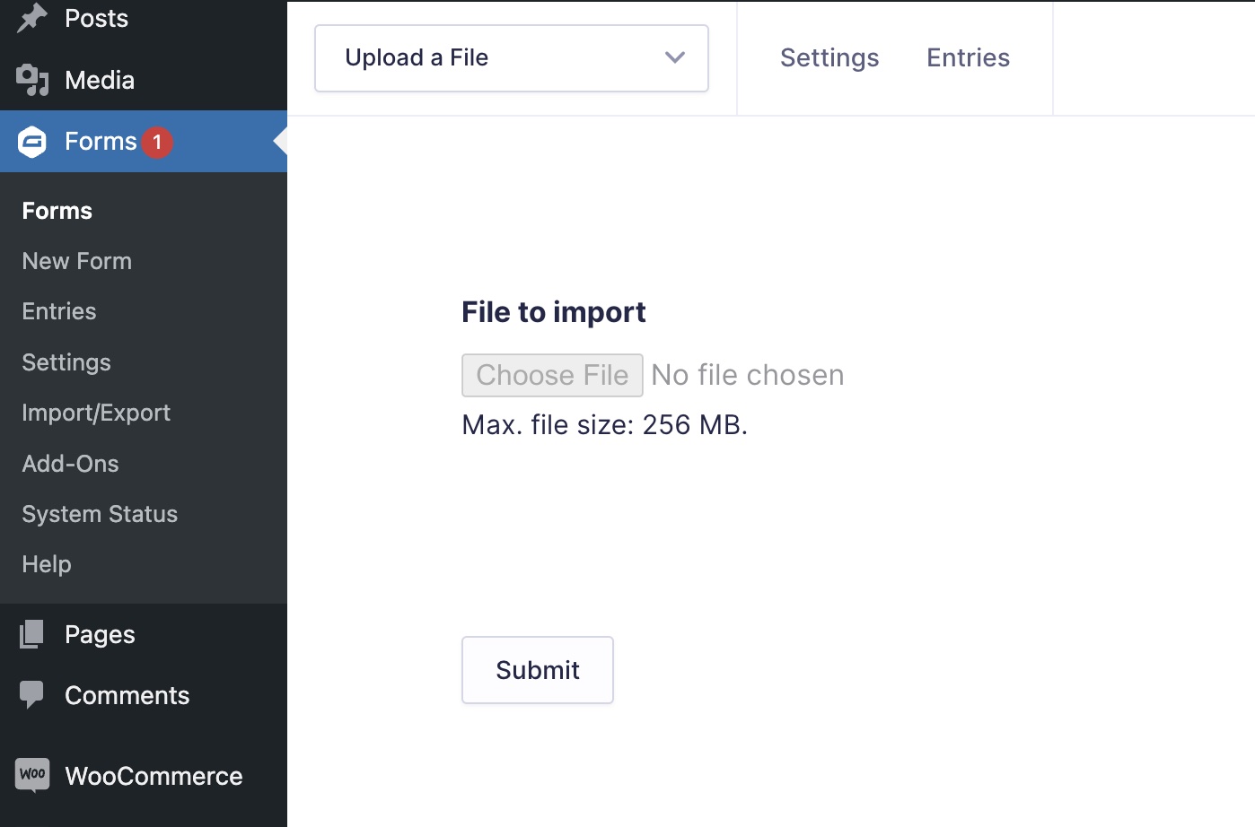 Using Gravity Forms, create a new form on your WordPress site that allows uploading files. This form will be used by your users to upload the file to import.