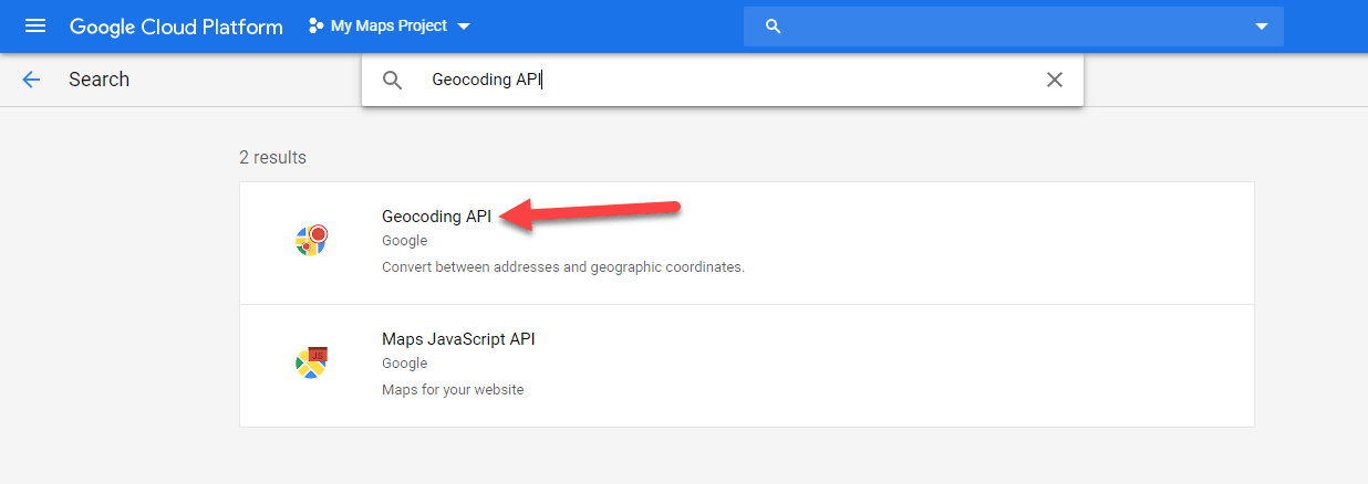 3. Enable the Geocoding API for the project by going to APIs & Services at https://console.cloud.google.com.