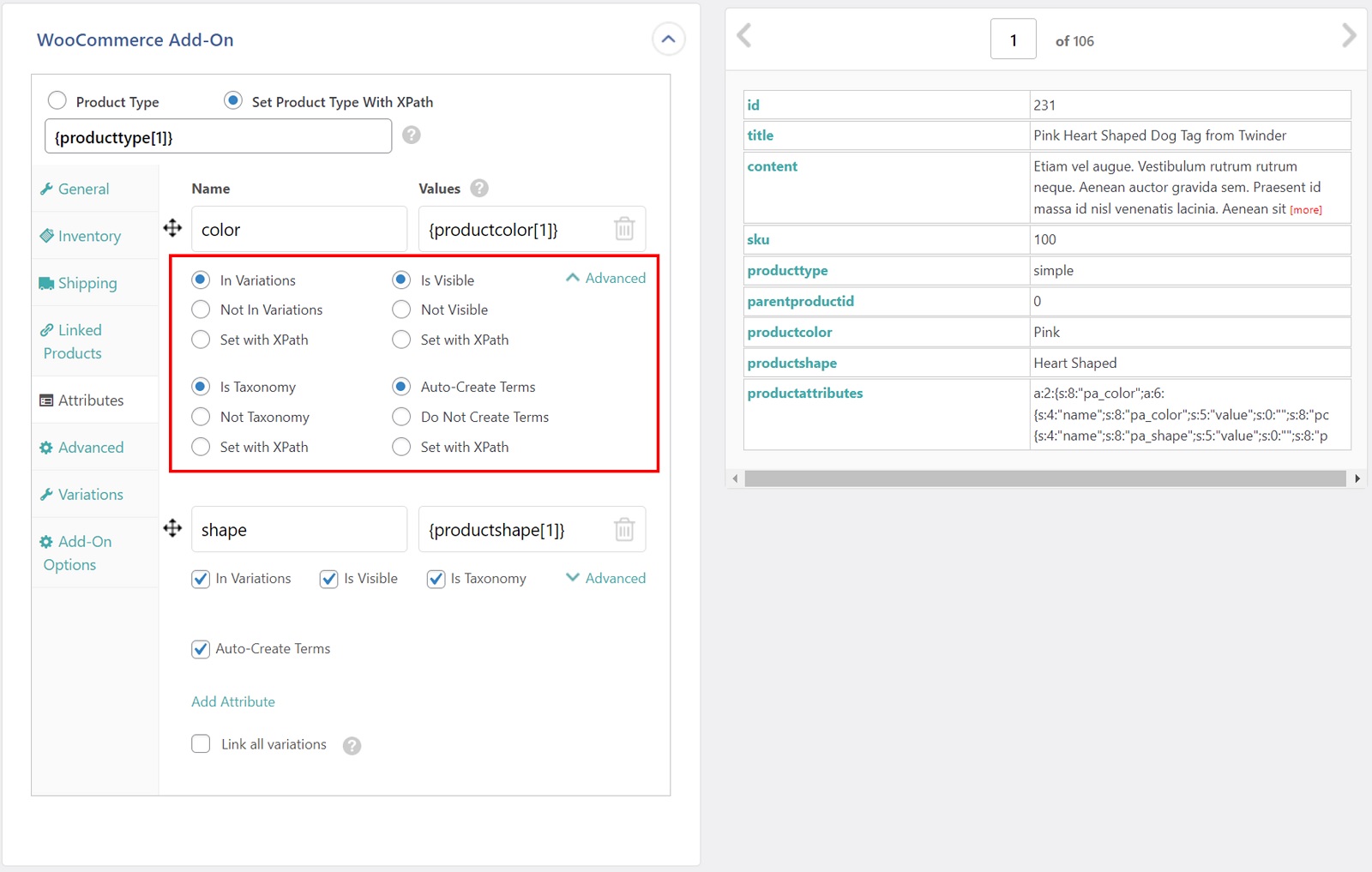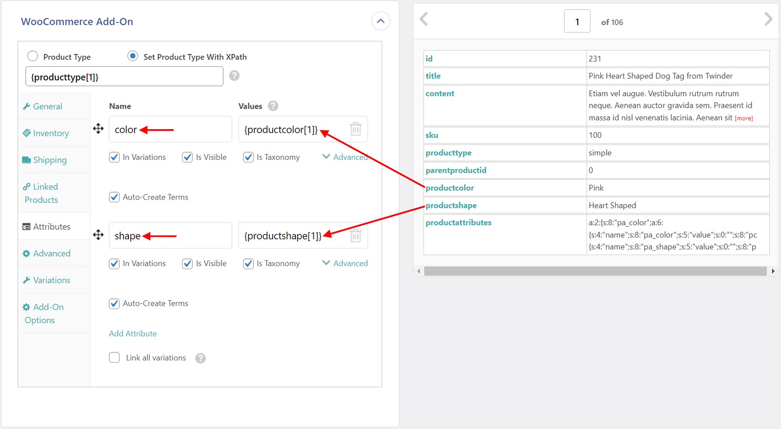 - In the Drag & Drop screen, in the Attributes tab of the WooCommerce Add-On section, use the Add Attribute link to create one attribute for every attribute that you intend to import. An attribute consists of a pair of fields: Name and Values.