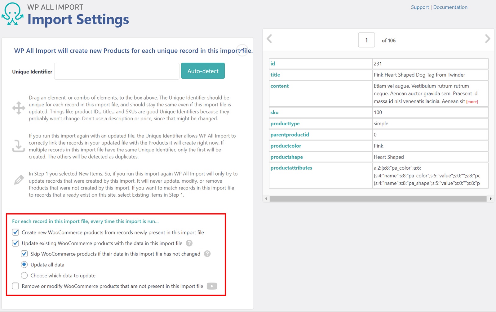 Fortunately, there are a set of options in the Import Settings screen that allow you to instruct WP All Import on exactly how to handle this situation. These include whether to create new records for new products, update existing products, or remove existing products if they are no longer in your import file.