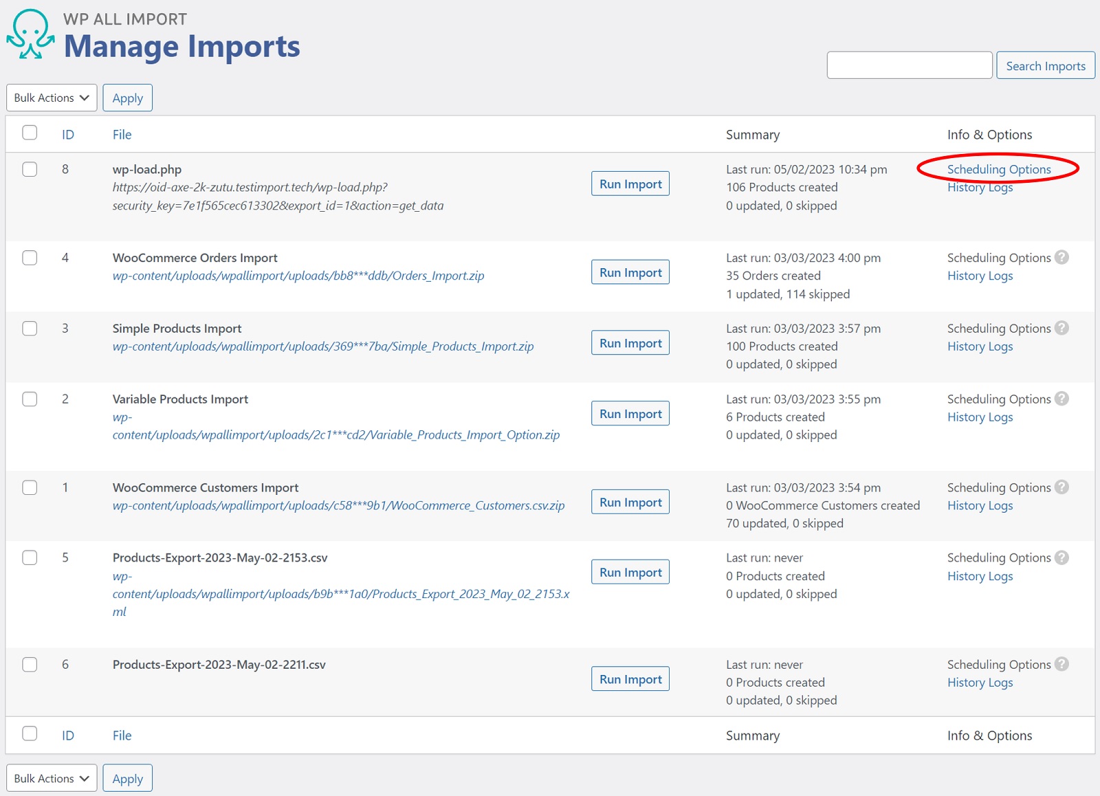 4. Locate your import and click Scheduling Options on the right-hand side.