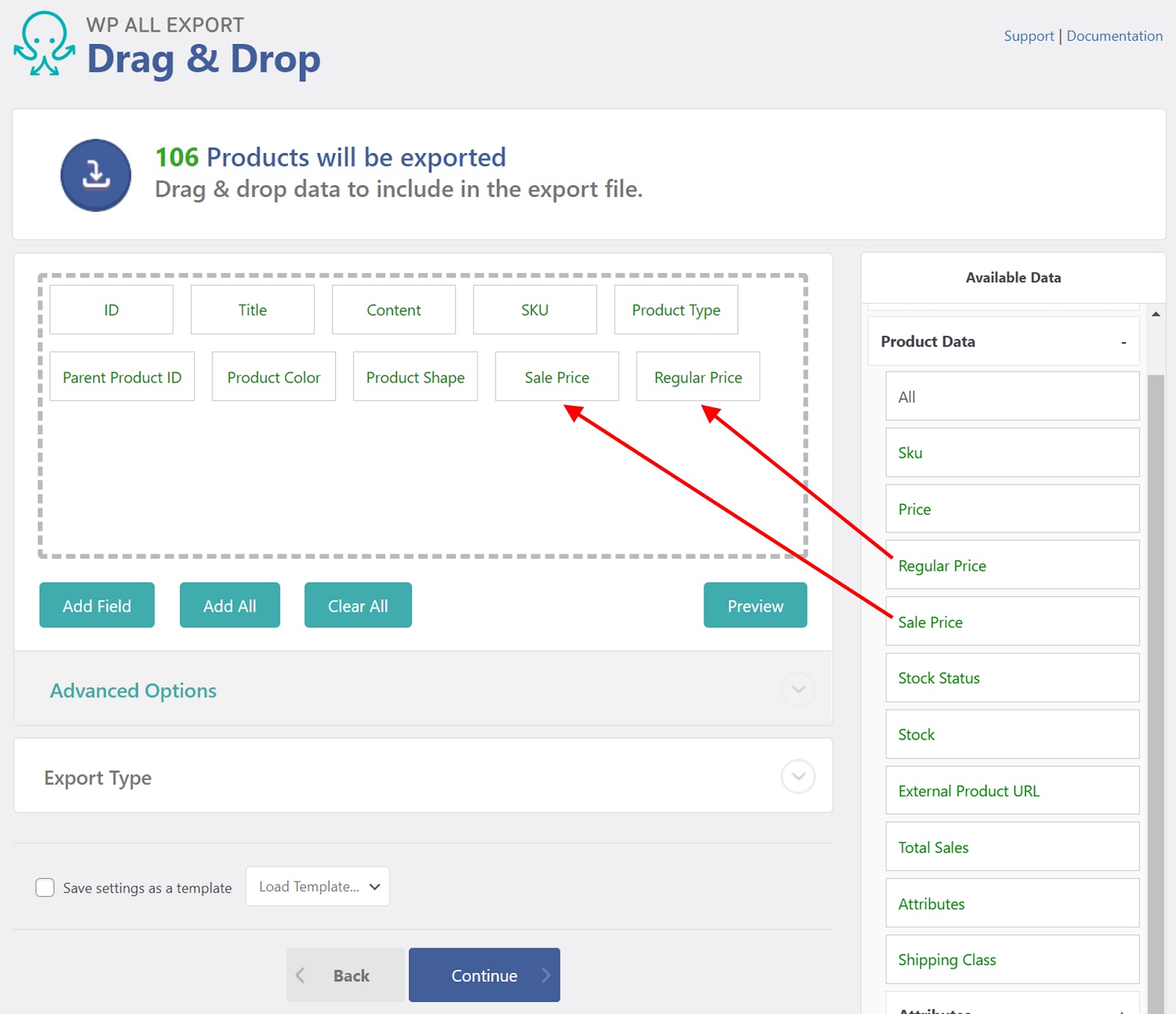 In most cases, you don't need to export all of your product fields. Our simple Drag & Drop interface allows you to select the exact fields that you want.