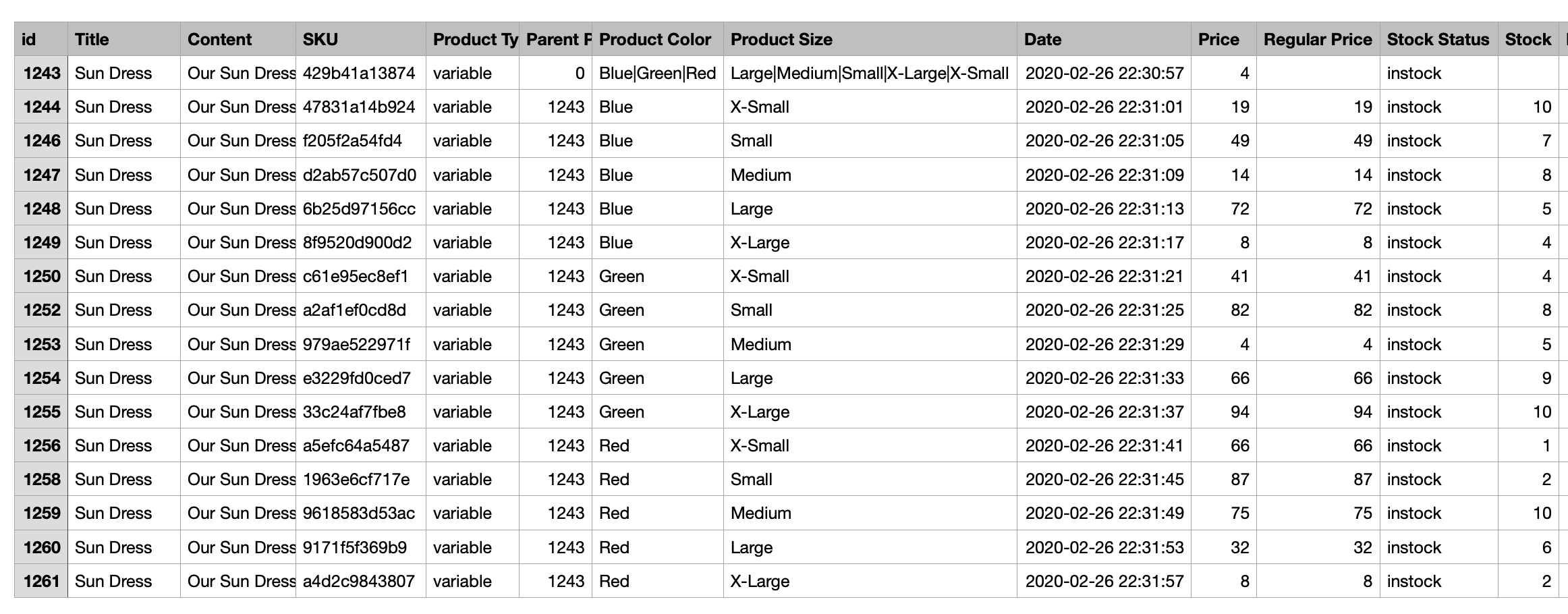 • Parent Product ID: WooCommerce variable products are attached to a parent product, and this exports the post ID of that parent product (a 0 is exported for products without a parent).