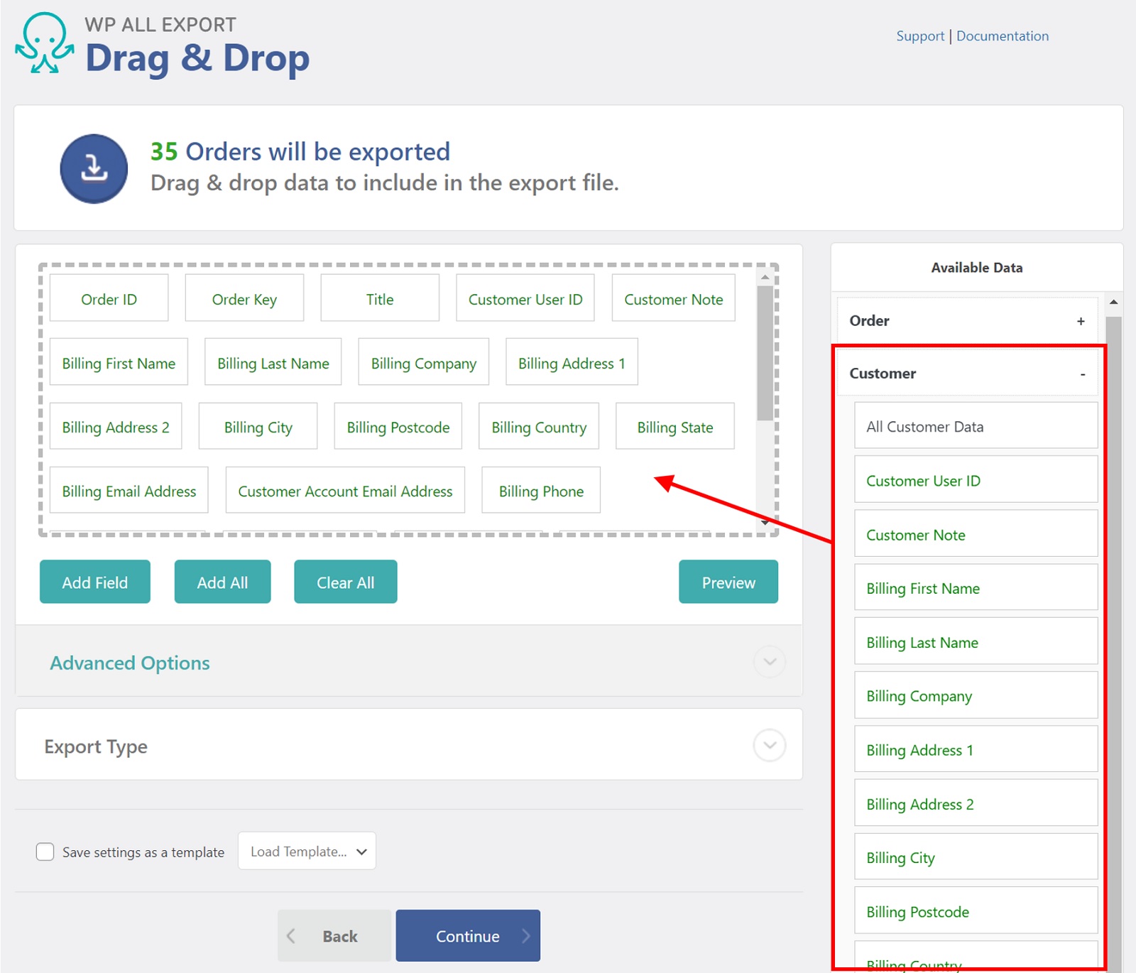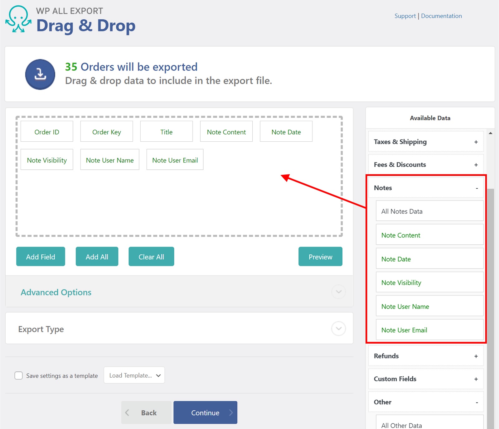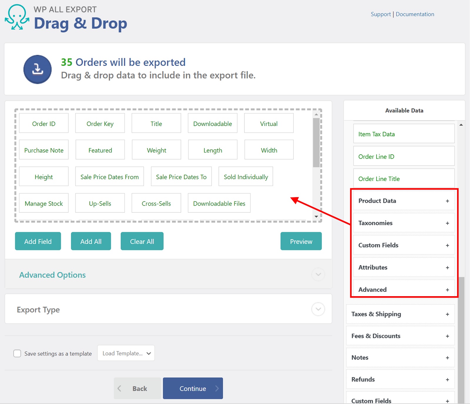 All of the relevant order tables and fields are listed in the Available Data section on the right. To include a field as a column in the order export file, simply drag the field into the column selection area: