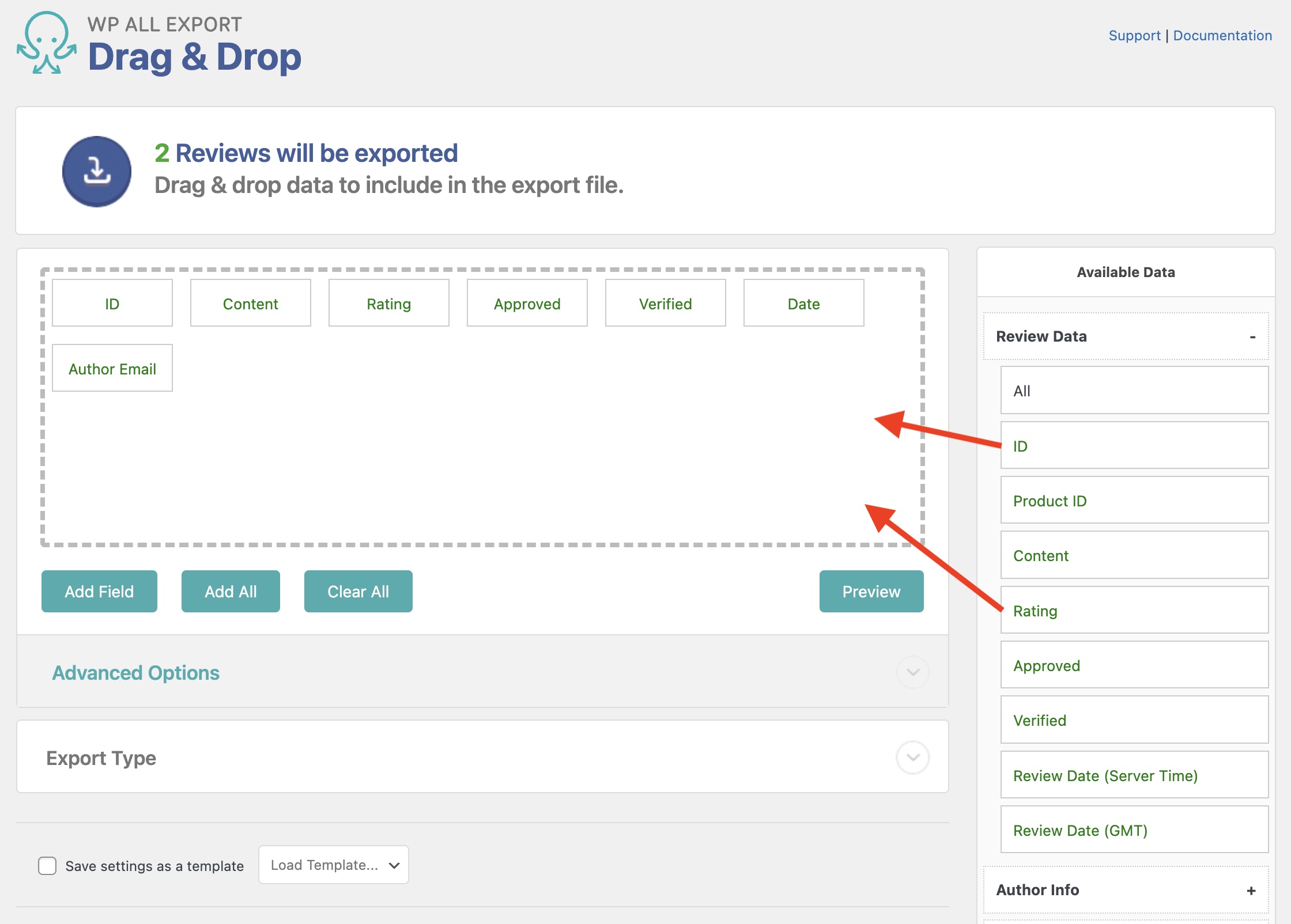 To export reviews, go to All Export › New Export and select WooCommerce Reviews. Filter the review data with our powerful filter tool. Configure your export columns using our Drag & Drop interface, then run the export and download your exported reviews.