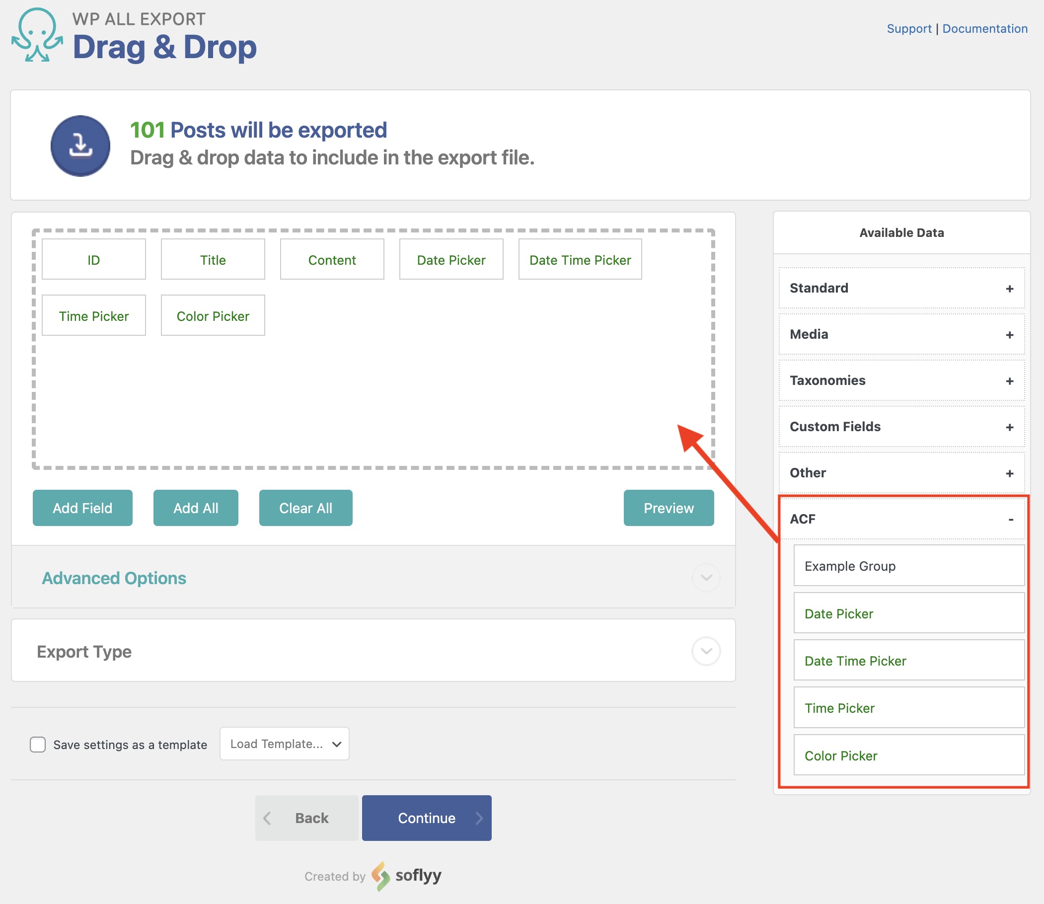 WP All Export detects all ACF fields in the posts you're exporting. To customize your export file, drag fields from the Available Data › ACF section and drop them into the editor on the left.