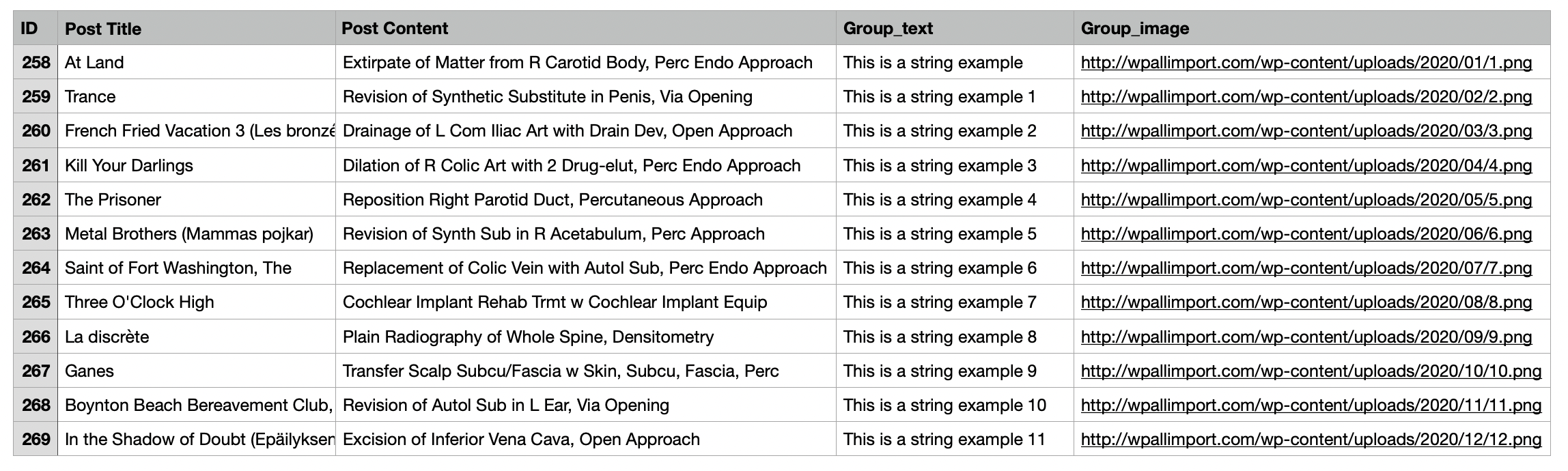 The ACF group field adds an export column for each field that it contains. Following the previous example, this ACF group field exports:
