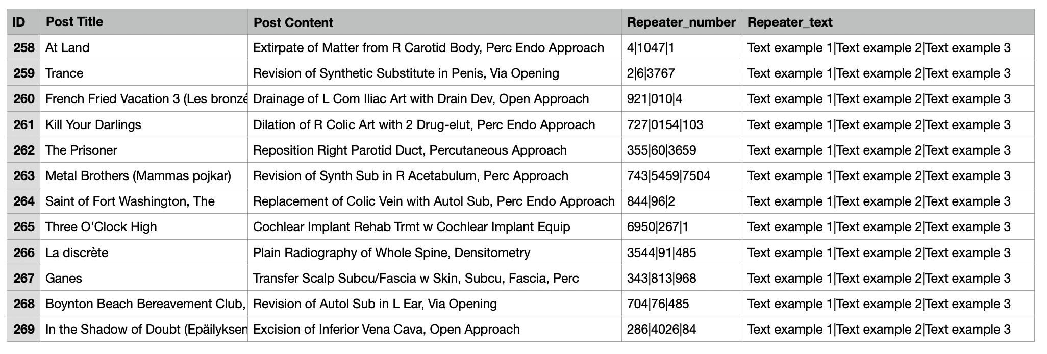 • A Repeater_text column that contains all repeated text strings separated by a pipe ( | ) character.