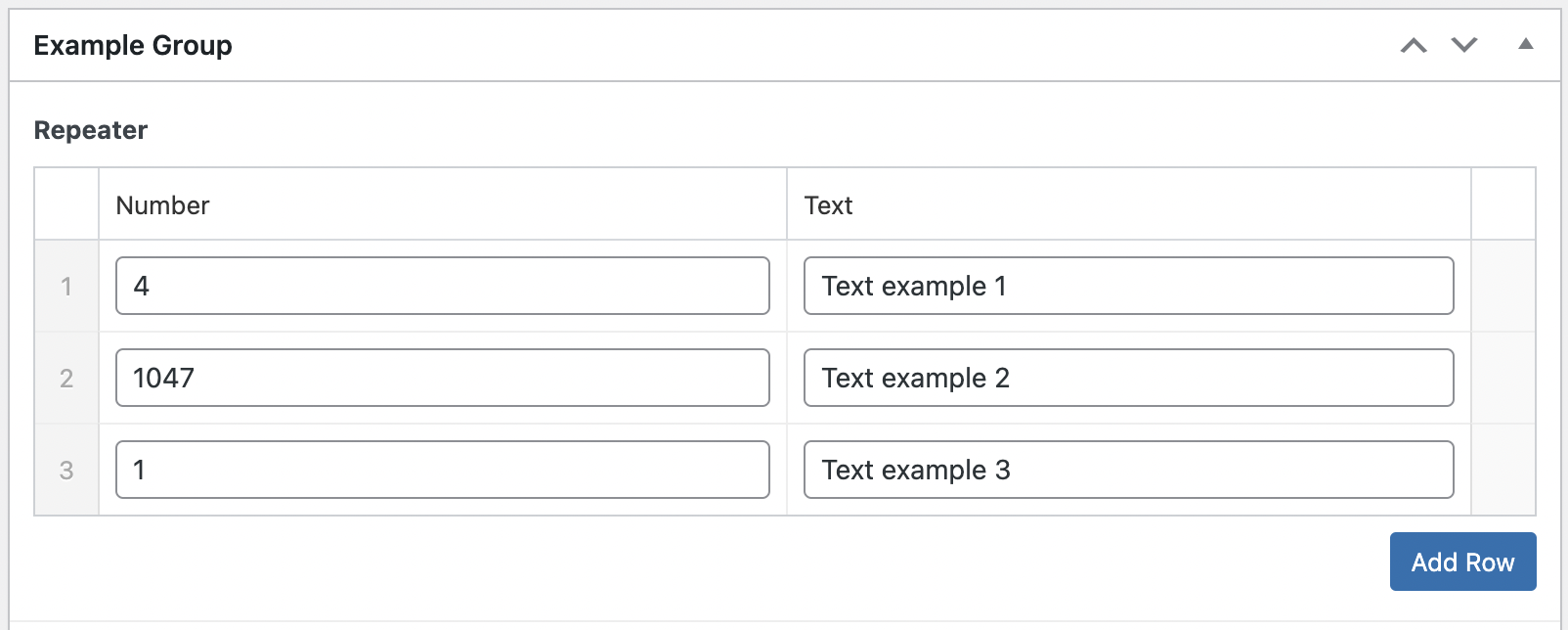 For example, this repeater field contains a number field and a text field: