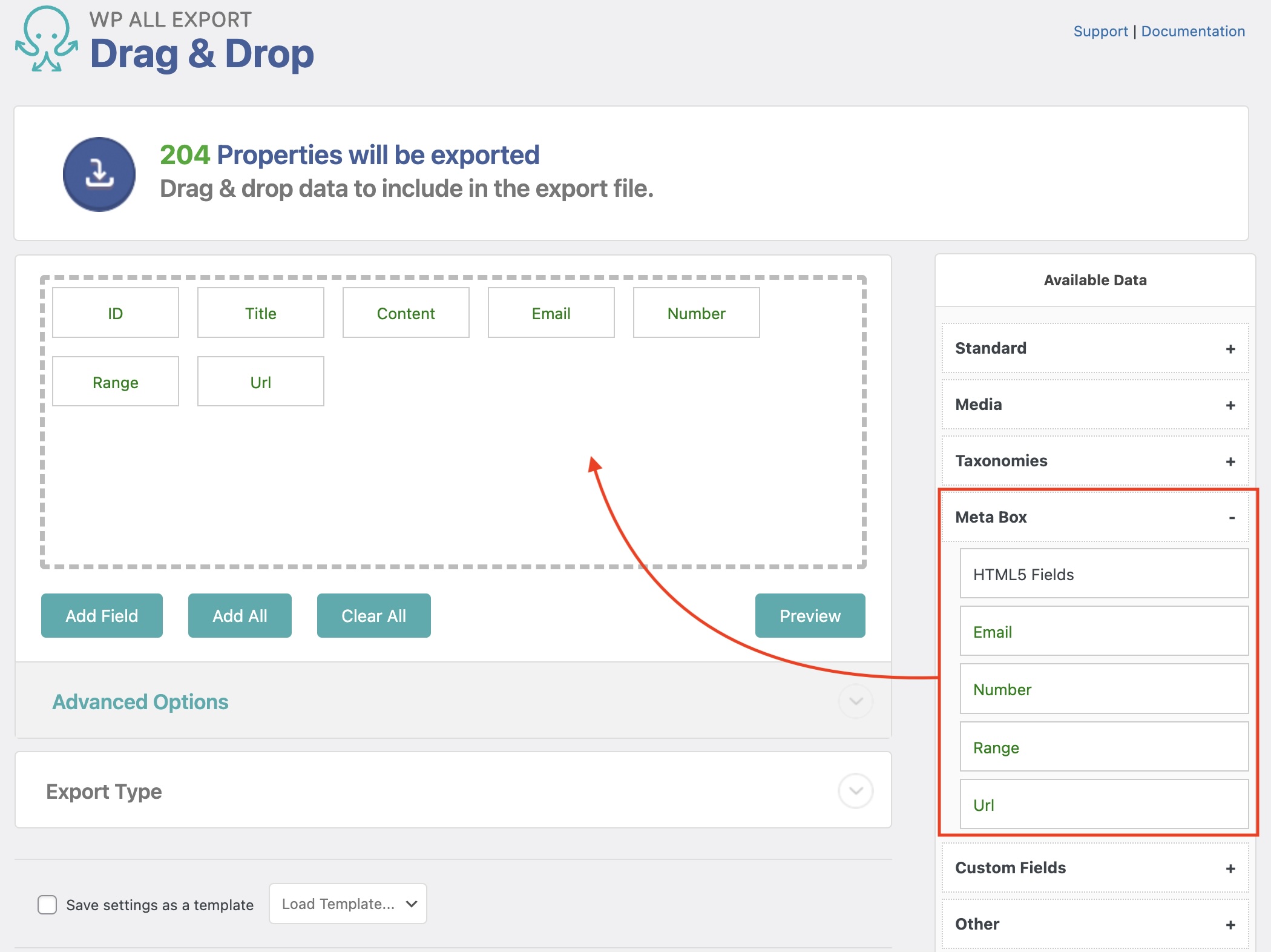 To export Meta Box HTML5 fields, navigate to All Export › New Export, select the post type with attached Meta Box HTML5 fields, and then customize the export template. You can drag & drop the Meta Box fields from Available DataMeta Box.