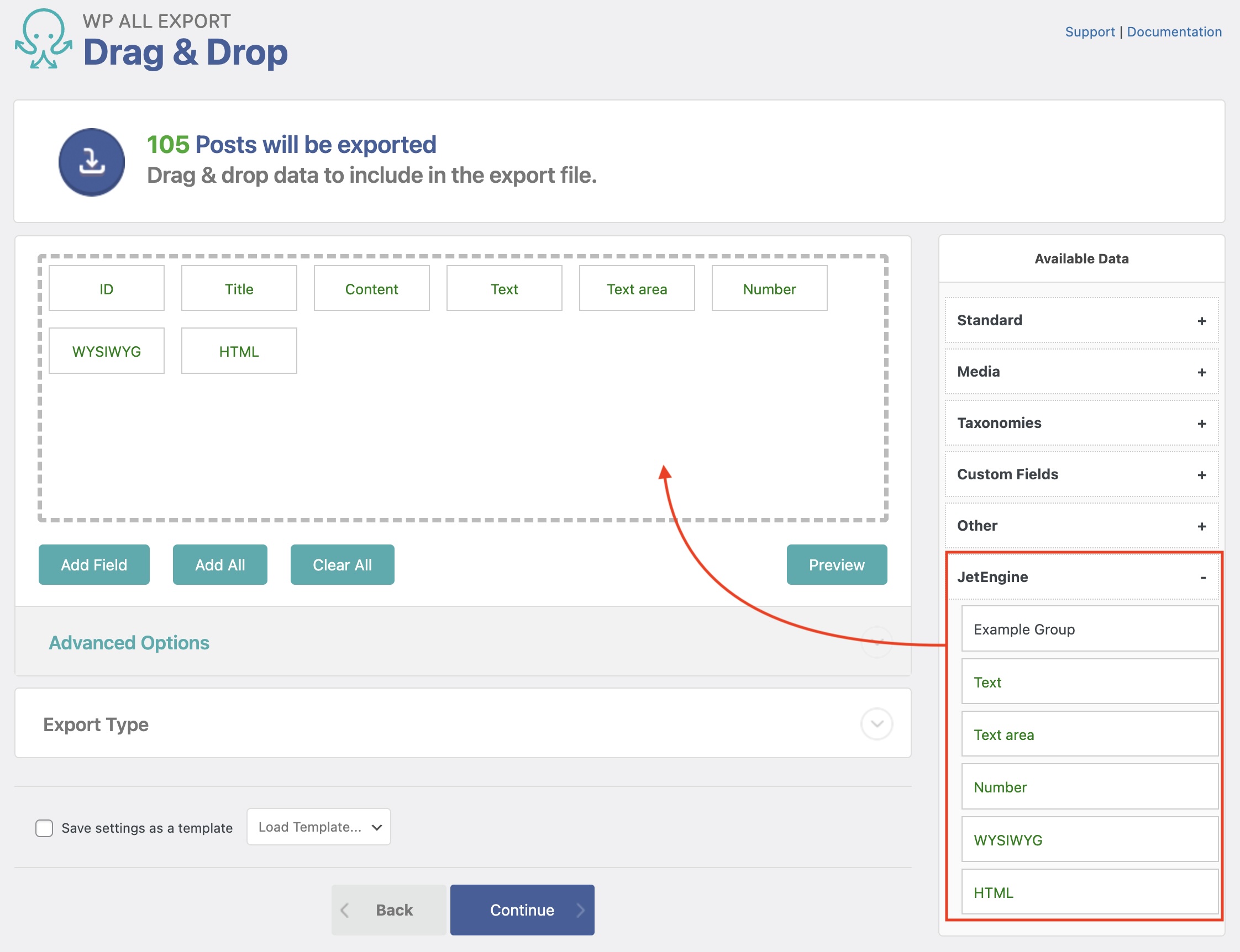 To export JetEngine text fields, go to All Export › New Export, choose the post type with the JetEngine Text fields attached to it, and continue the export process. Drag and drop the exportable data from under the JetEngine section.