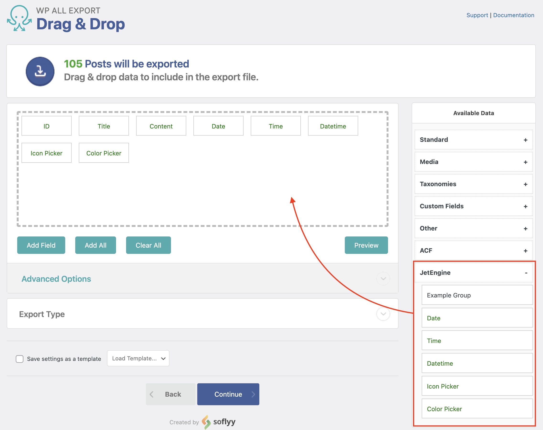 To export JetEngine picker fields, go to All Export › New Export, choose the post type with the JetEngine picker fields attached to it, and continue the export process. Drag and drop the exportable picker data from under the JetEngine section.