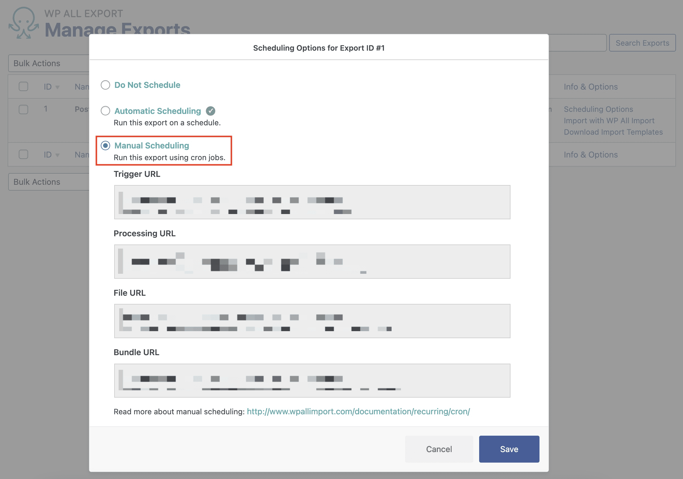 To set up an export with Manual Scheduling, WP All Export actually uses two cron jobs to make sure they run on time and finish the export.