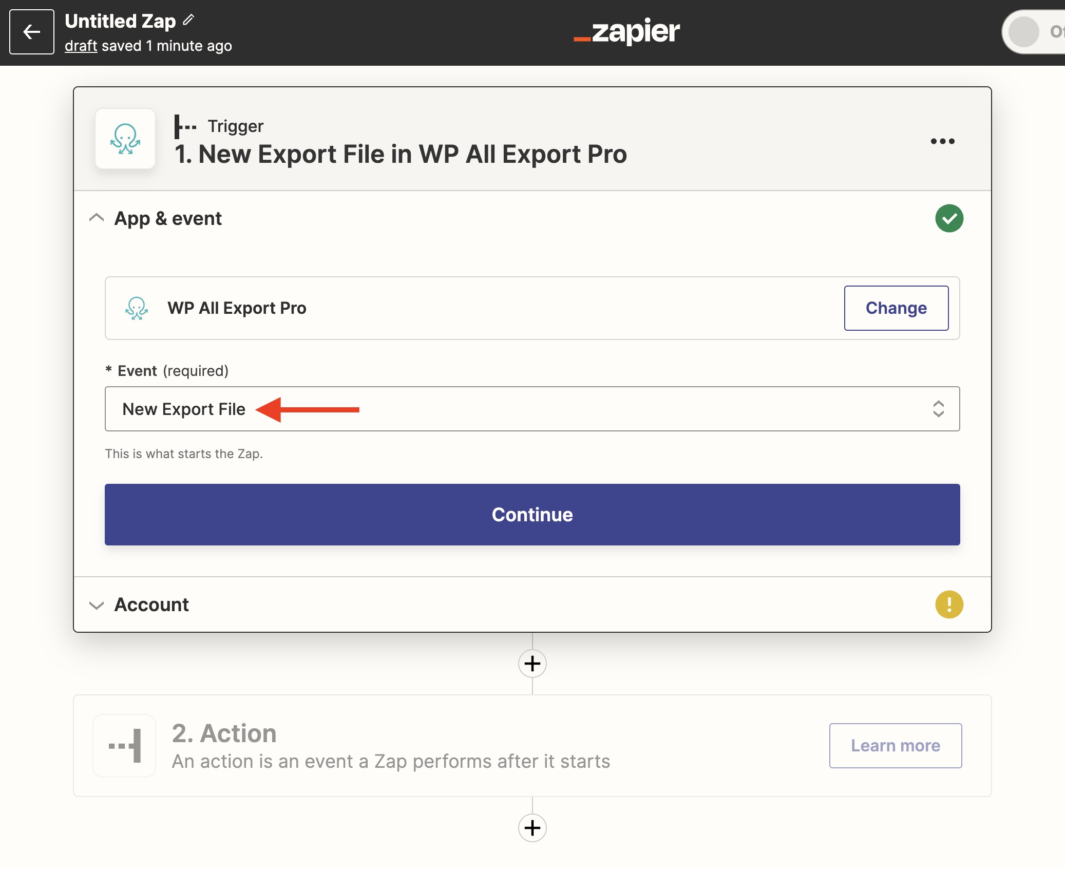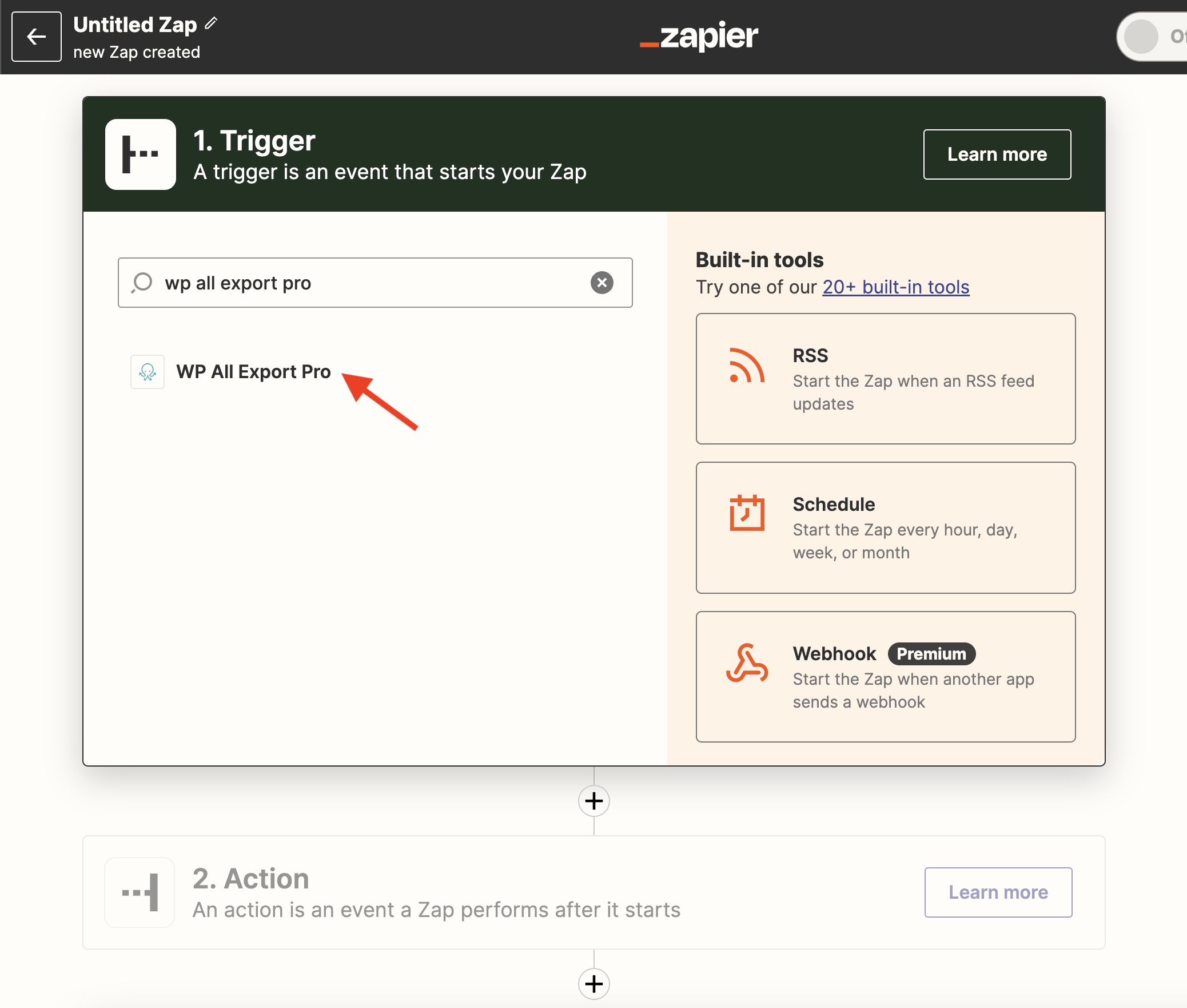 First, select WP All Export Pro as the trigger app. The trigger is what initiates the connection between Zapier and WordPress.