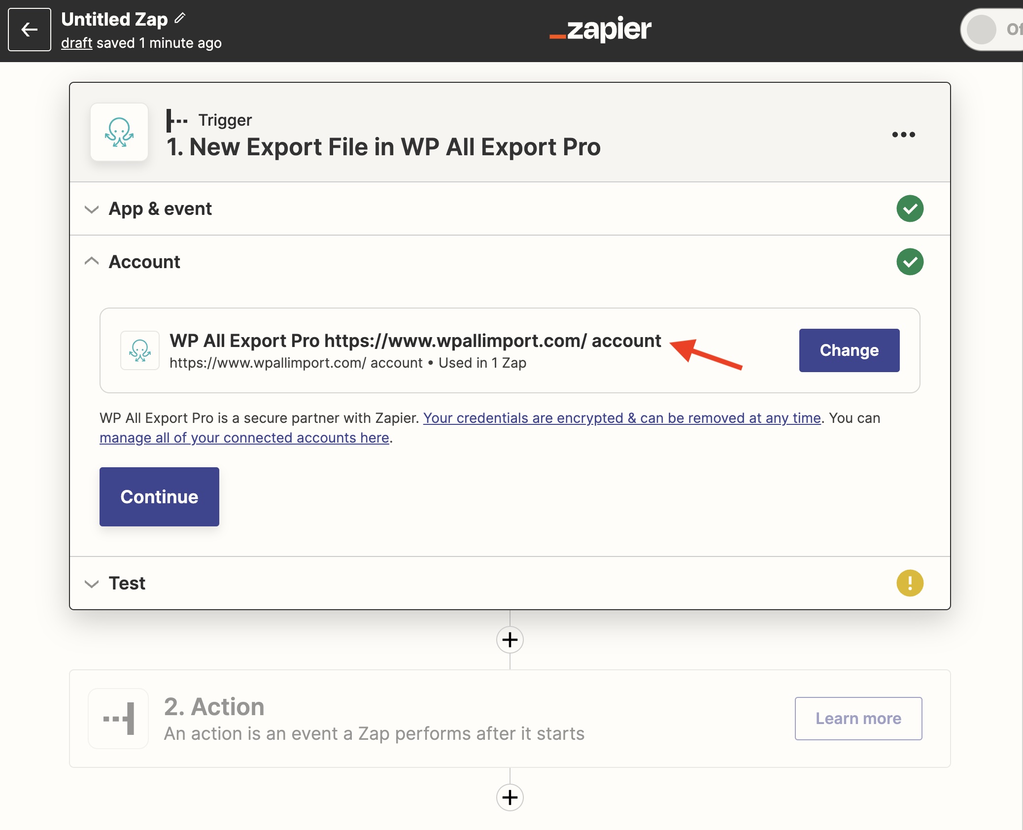 This is where you test what you've done so far by making sure that the connection between Zapier and WordPress is correct. The latest export on your site will be retrieved: