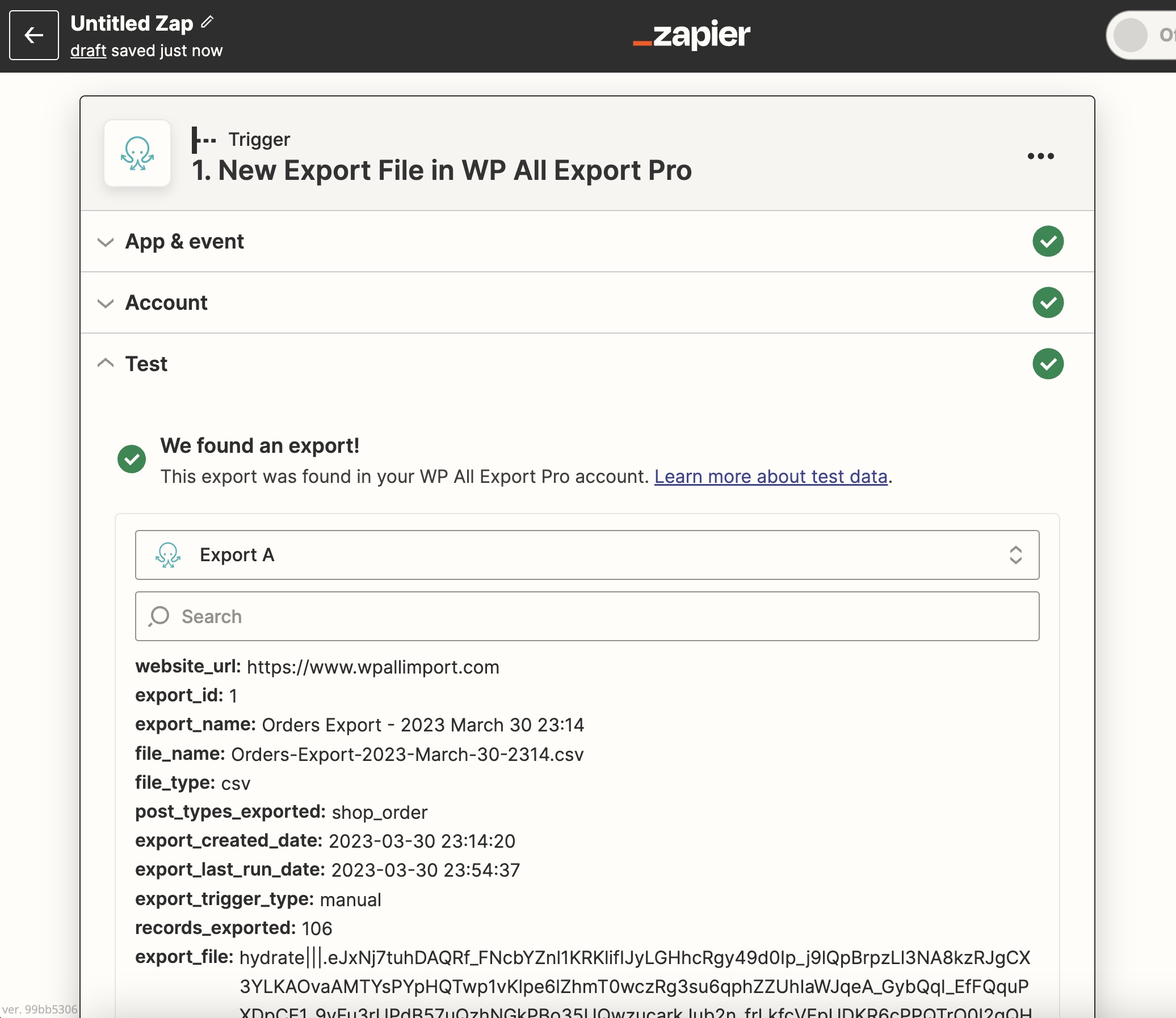 When an export is successfully completed, WP All Export will send Zapier the export information, such as the export file’s URL, the post types exported, the number of records in the export file, etc.