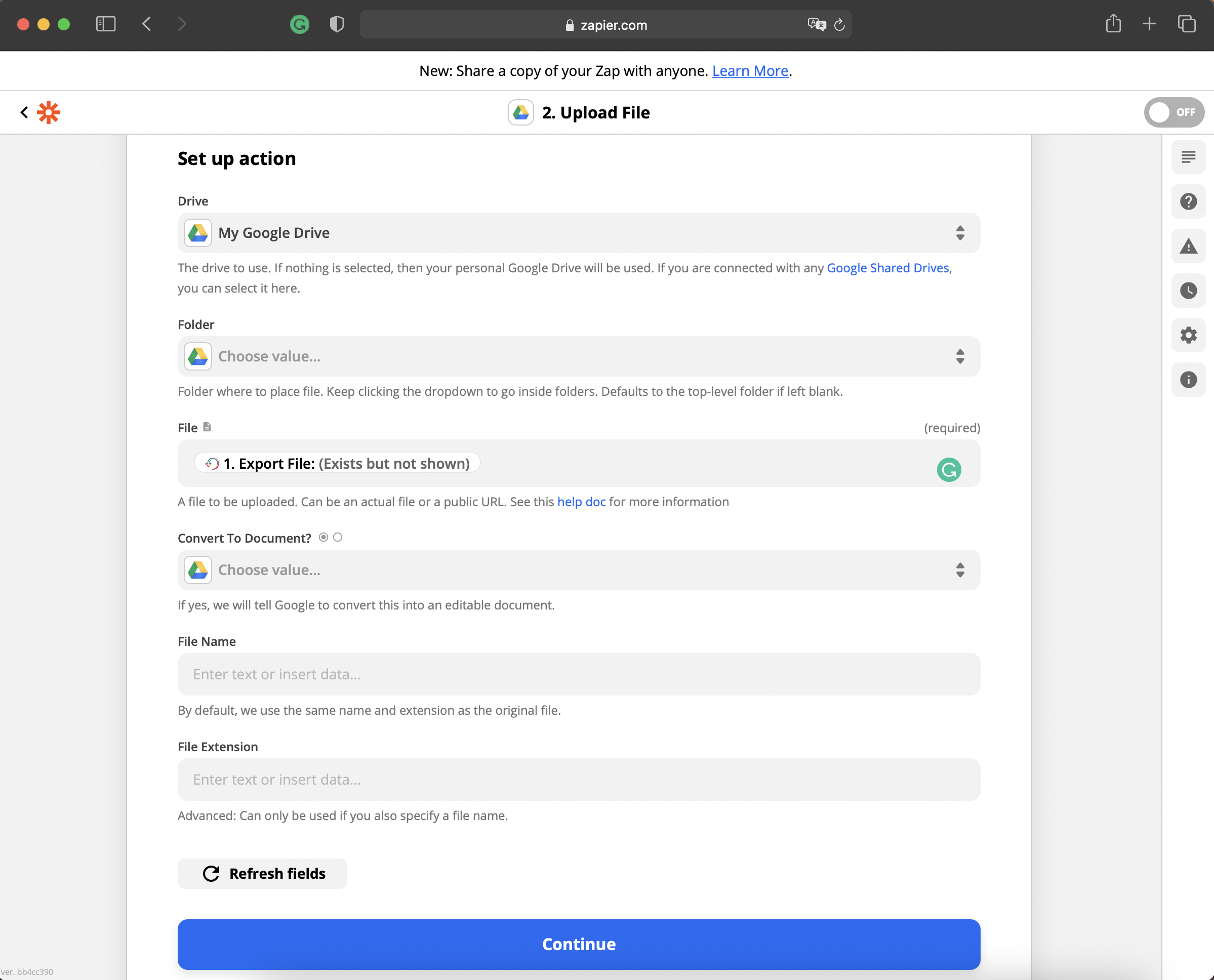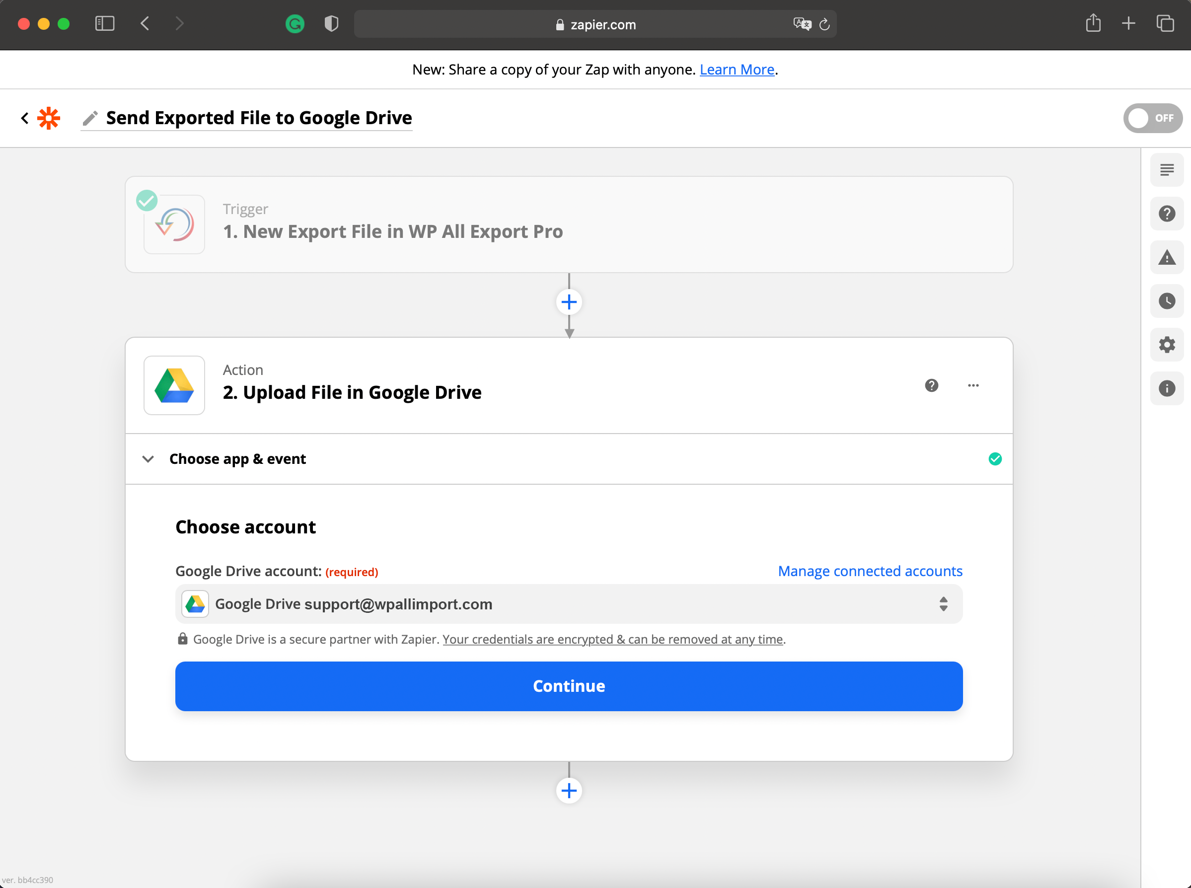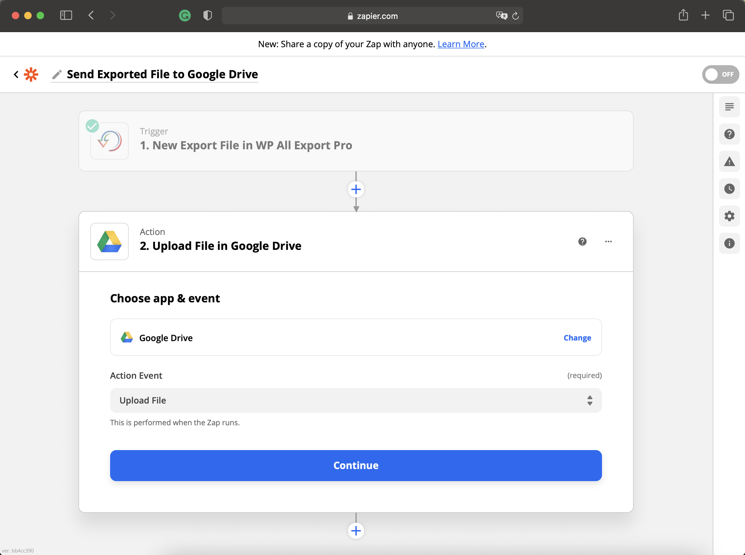 Select Google Drive as the app and Upload File as the action event, then click on Continue. This event will upload the export file into the selected Google Drive account.