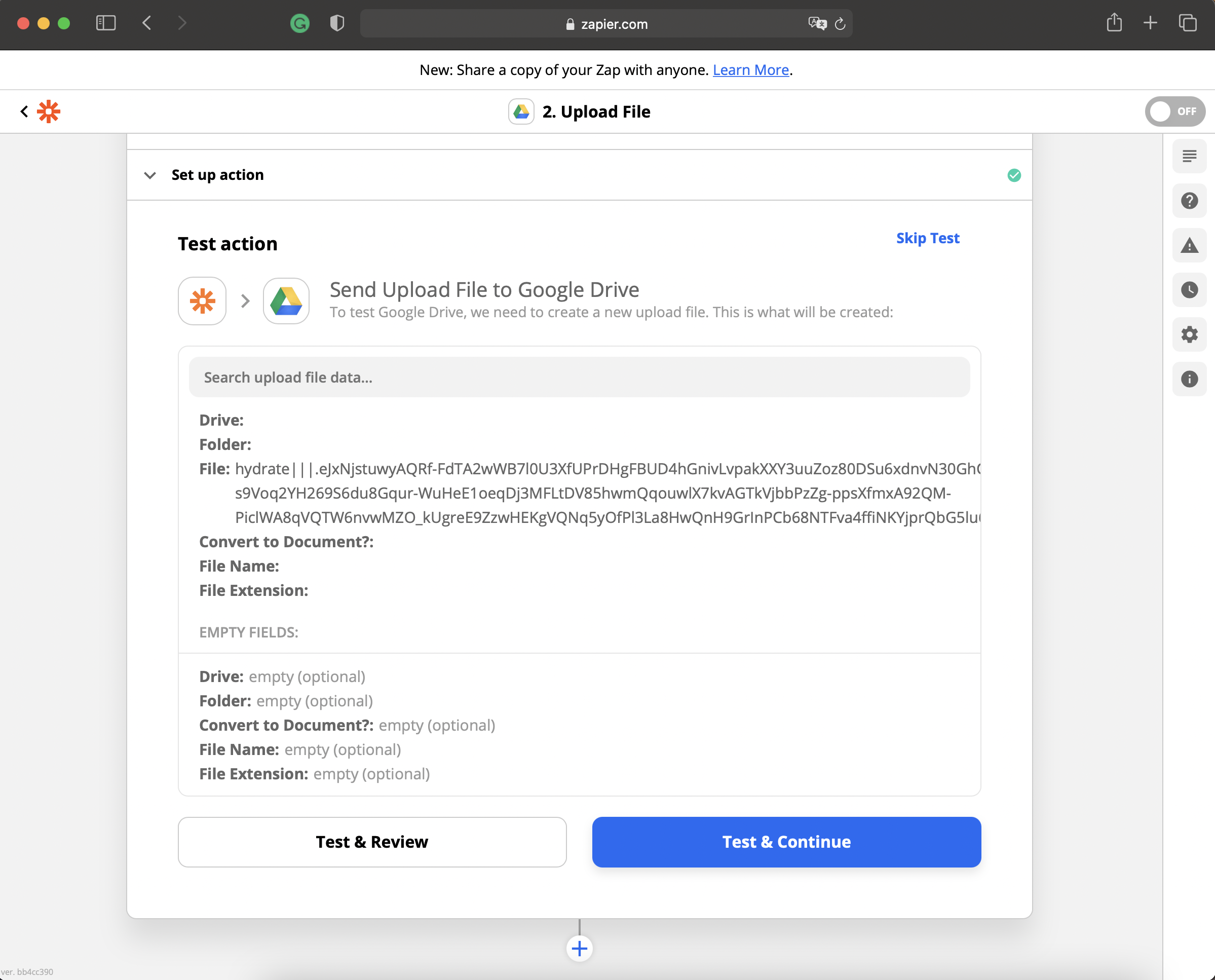 Once the Google Drive integration has been configured, Zapier will try to test it. Select Skip Test to avoid this step.