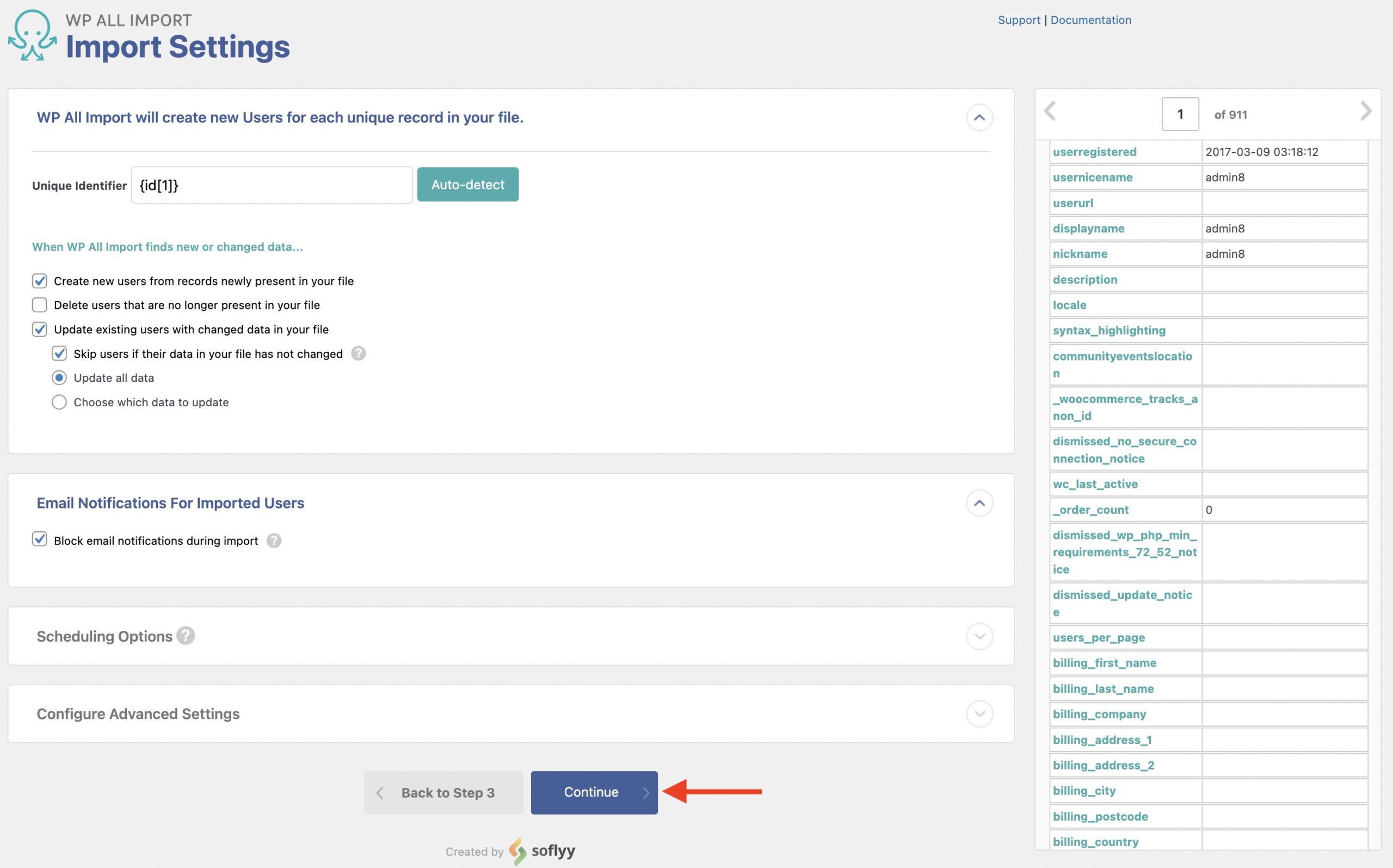 You can also define Scheduling Options to schedule this import regularly, and Configure Advanced Settings, such as only importing specific user records or modifying the number of records imported per iteration.