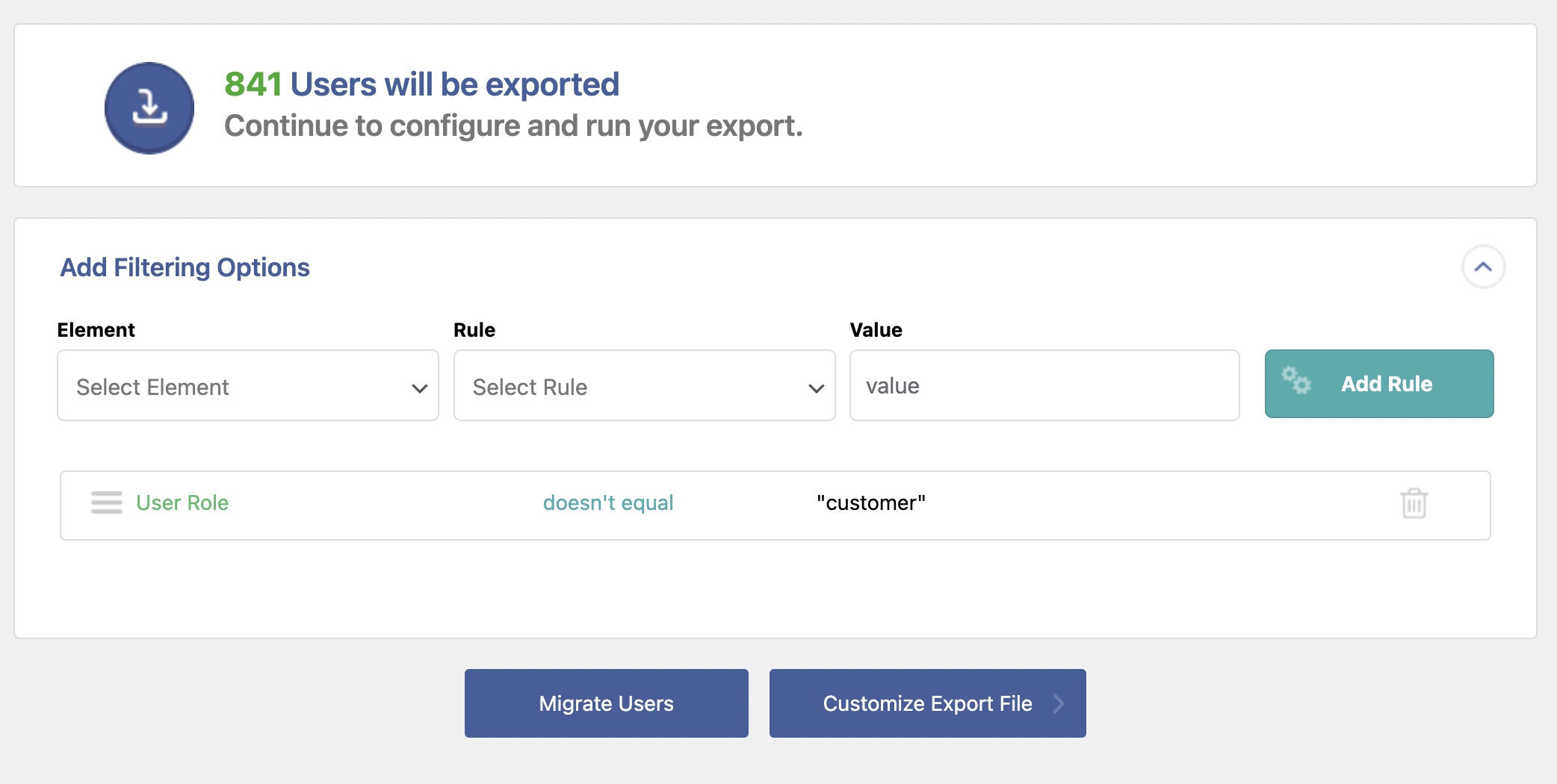 The screen will update to show you how many users will be exported. If needed, use Manage Filtering Options to limit the users migrated in this step.