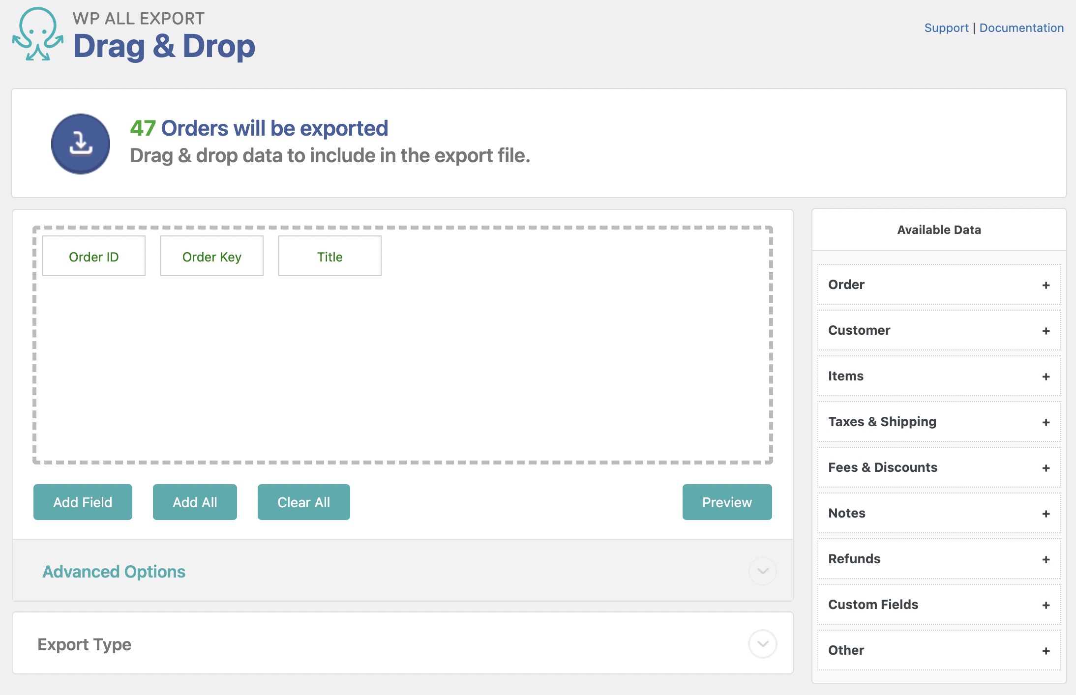 If you clicked Customize Export File, you can use our Drag & Drop interface to select your export columns. To migrate orders, you must at least select the columns needed to support a successful import on the destination site.