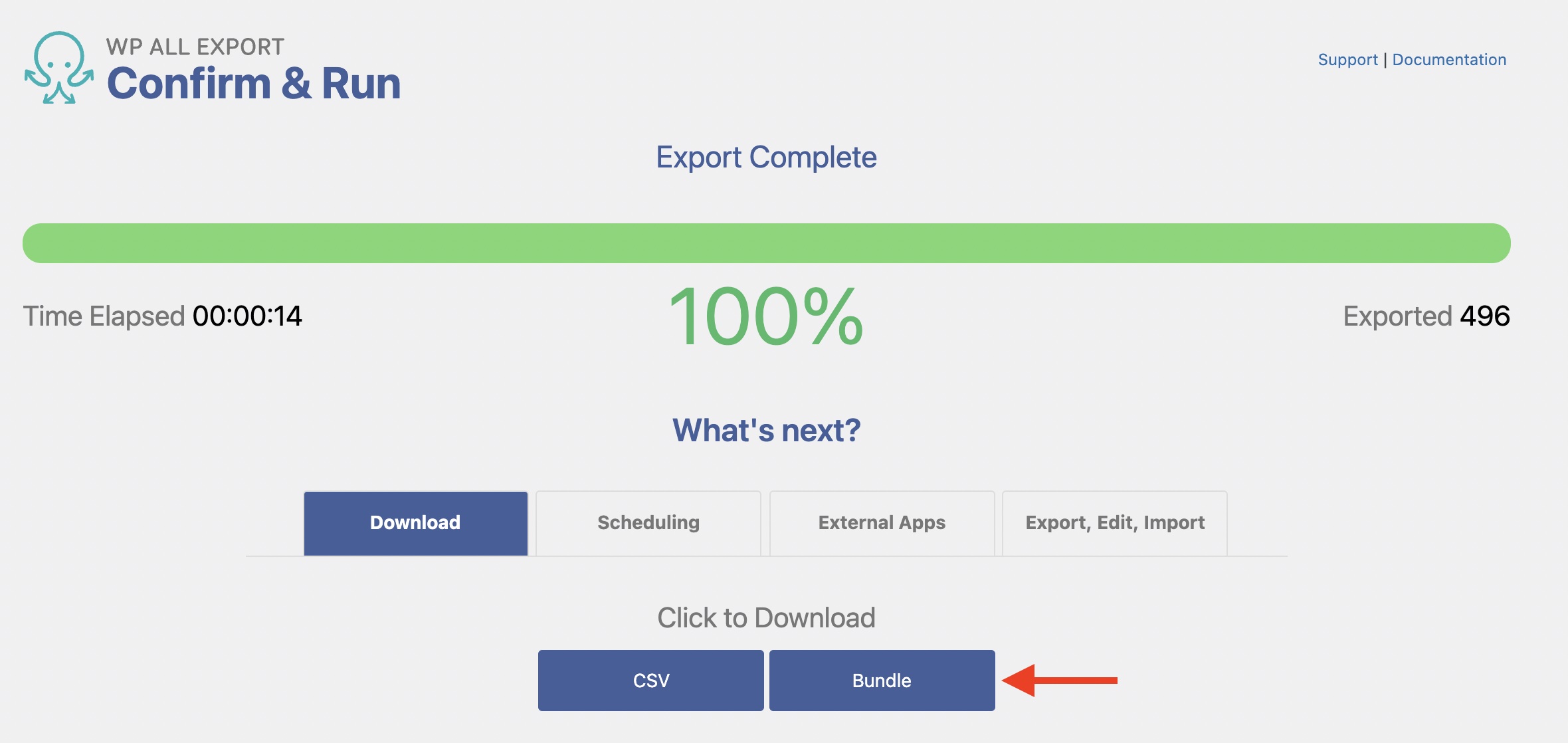 In the next screen, click Confirm & Run Export to execute the export. Once the export is complete, click Bundle to download a zip file containing your exported entries and a settings file for WP All Import: