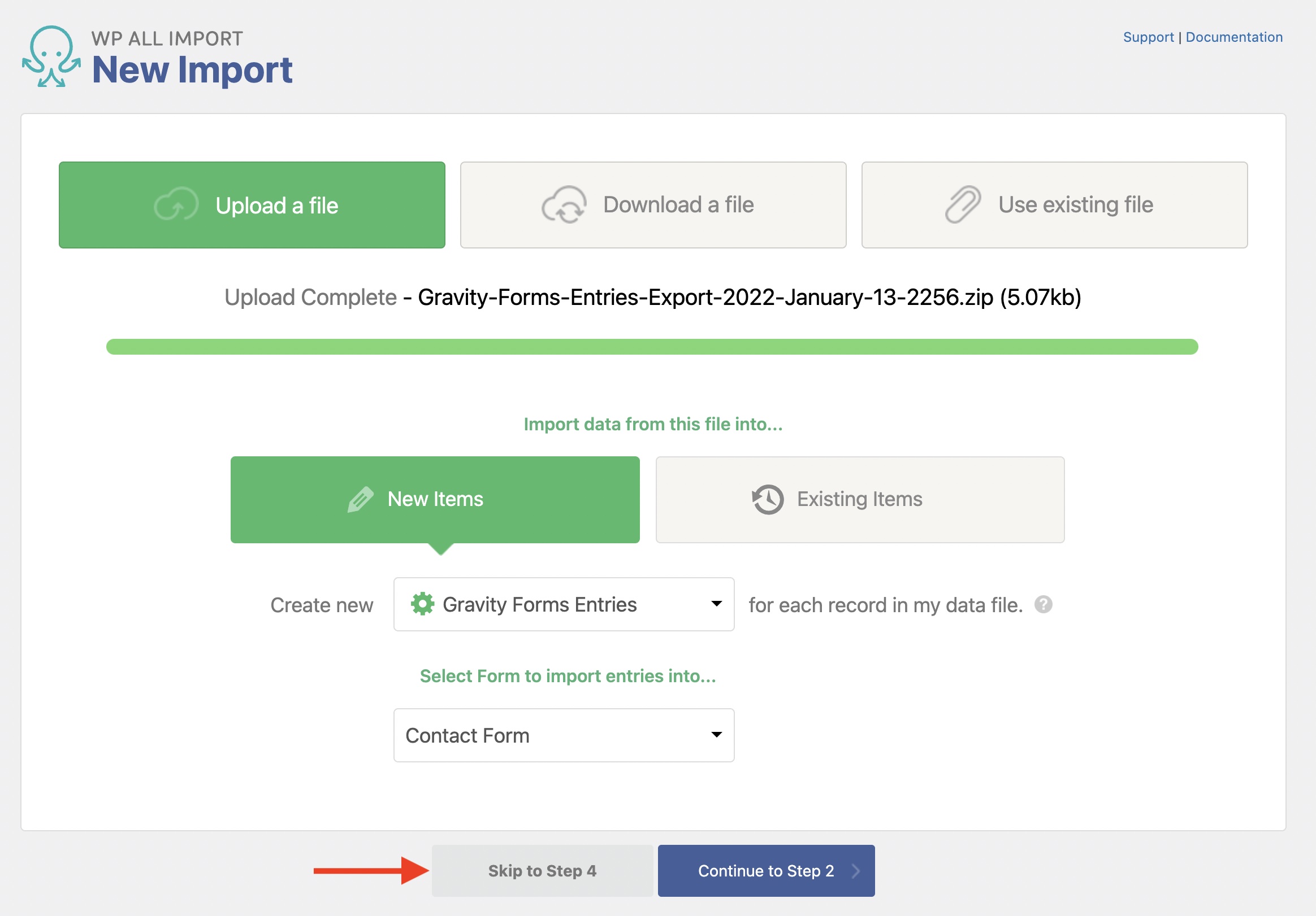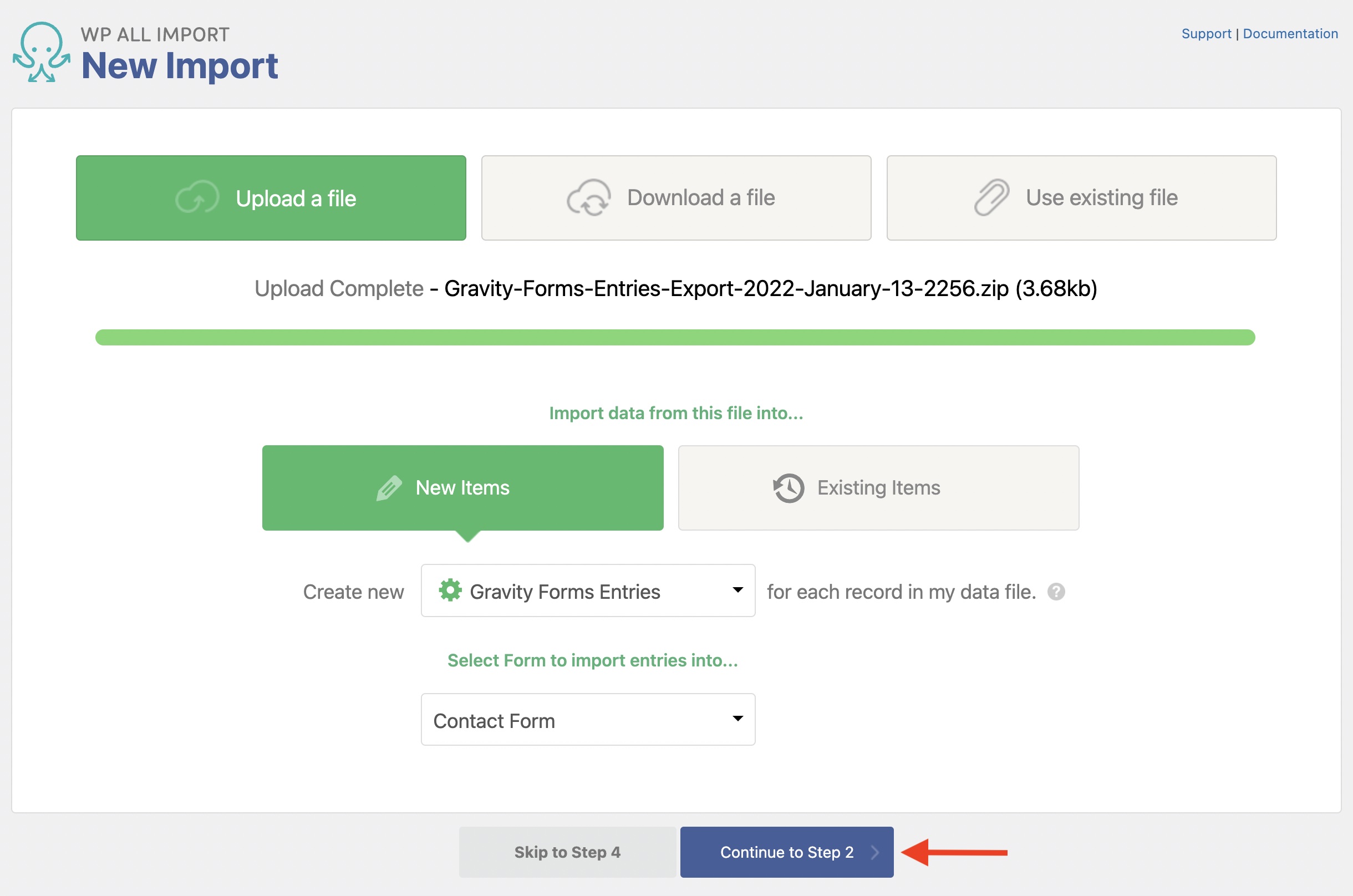 On the import site, go to All Import › New Import and upload the Bundle zip file that you exported. By using the bundle file, all form fields and settings will be automatically mapped.