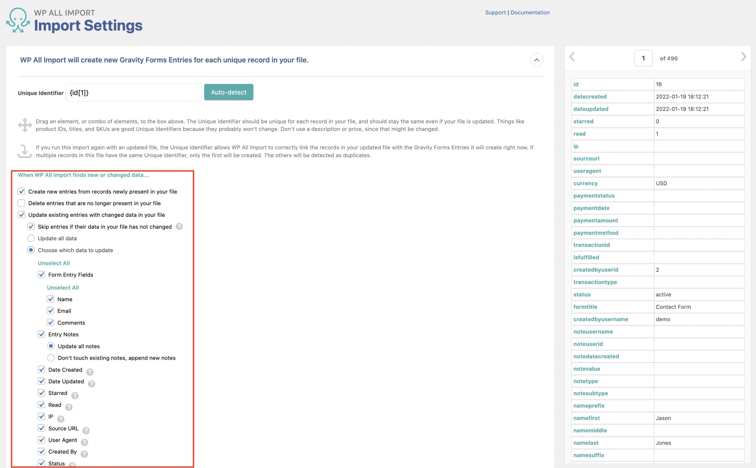 By selecting Choose which data to update, you can instruct WP All Import how to update the Gravity Forms entries that were previously imported by that same import.