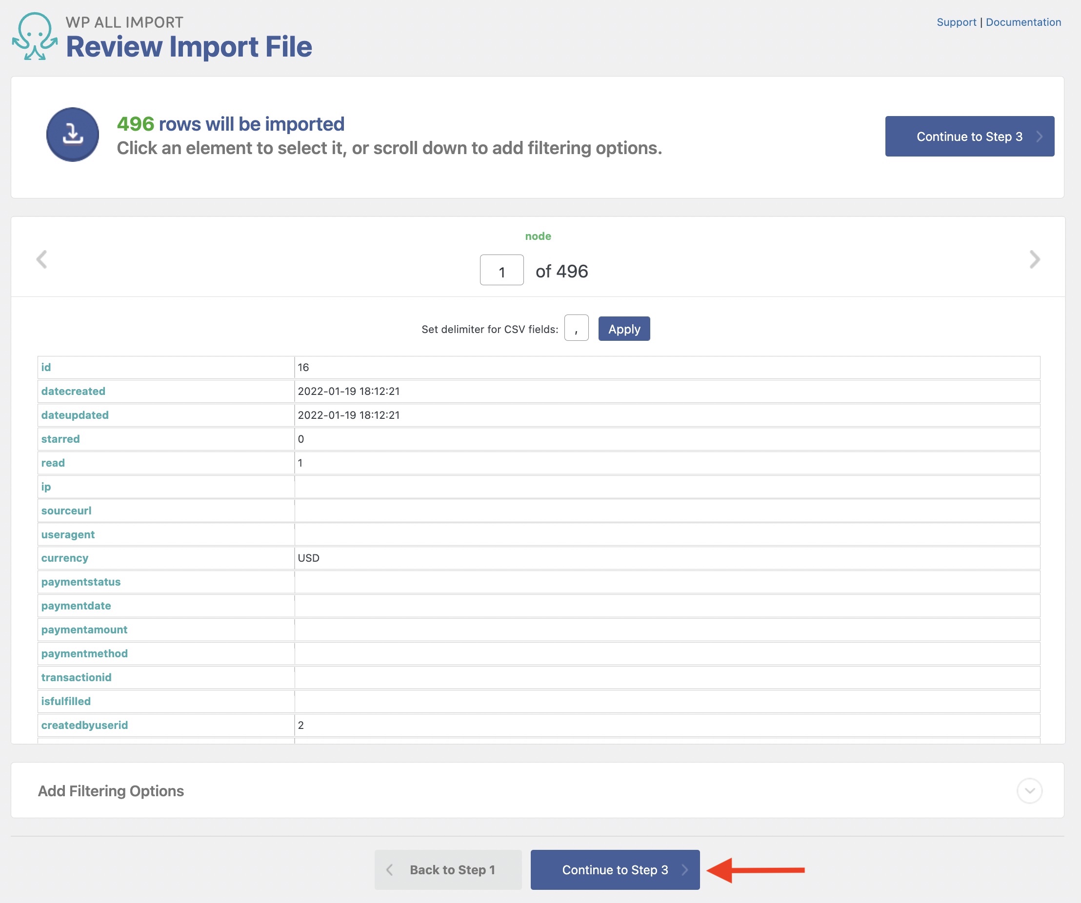 This addresses simple mapping adjustments. However, more complex data modifications can also be achieved using custom PHP code. Once everything is mapped, click Continue to Step 4 to navigate to the Import Settings screen:
