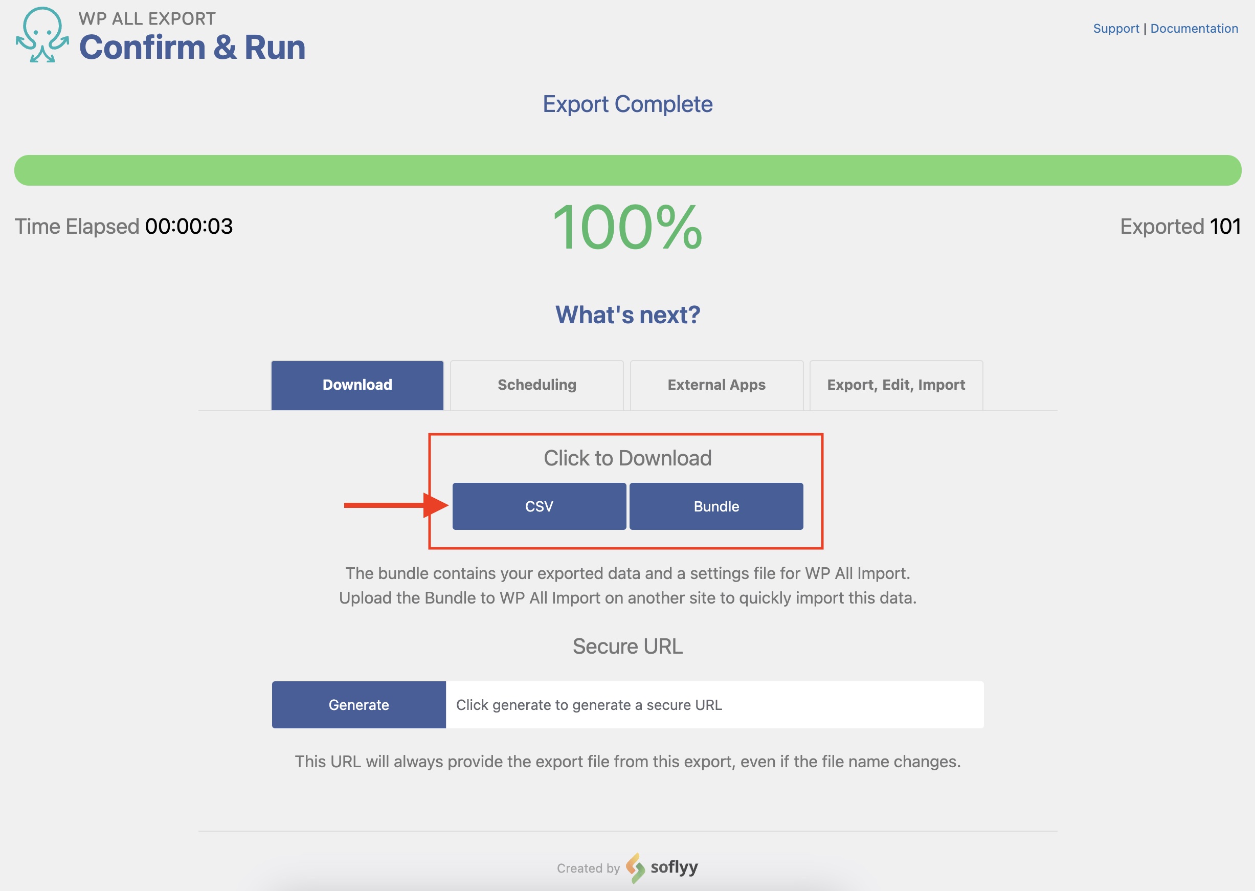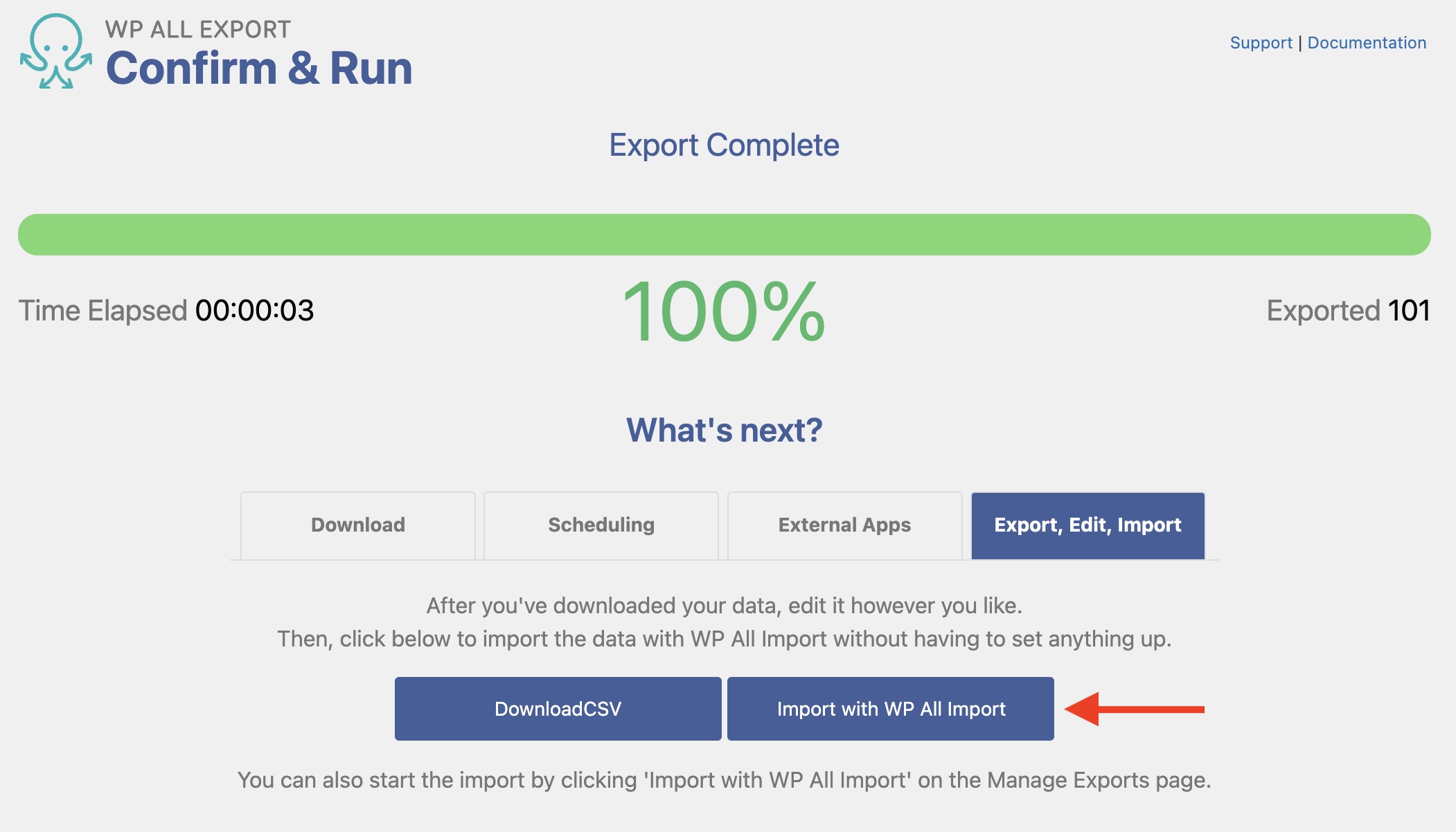 Go back to WP All Export. If you're still in the same Confirm & Run screen, choose the Export, Edit, Import tab, and then click the Import with WP All Import blue button.