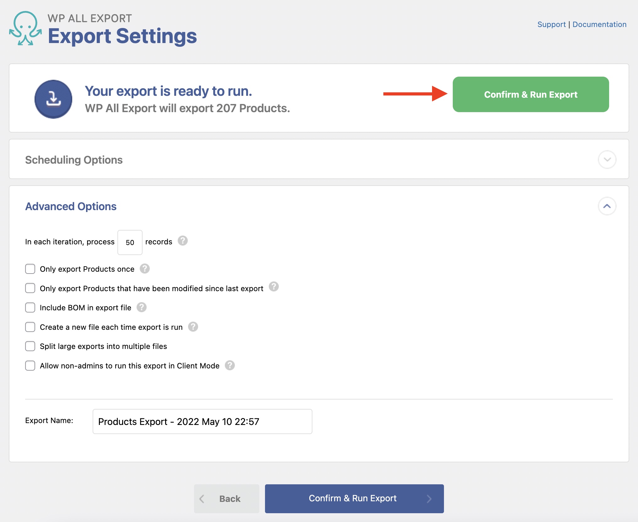 To complete the export, click on Confirm & Run Export.