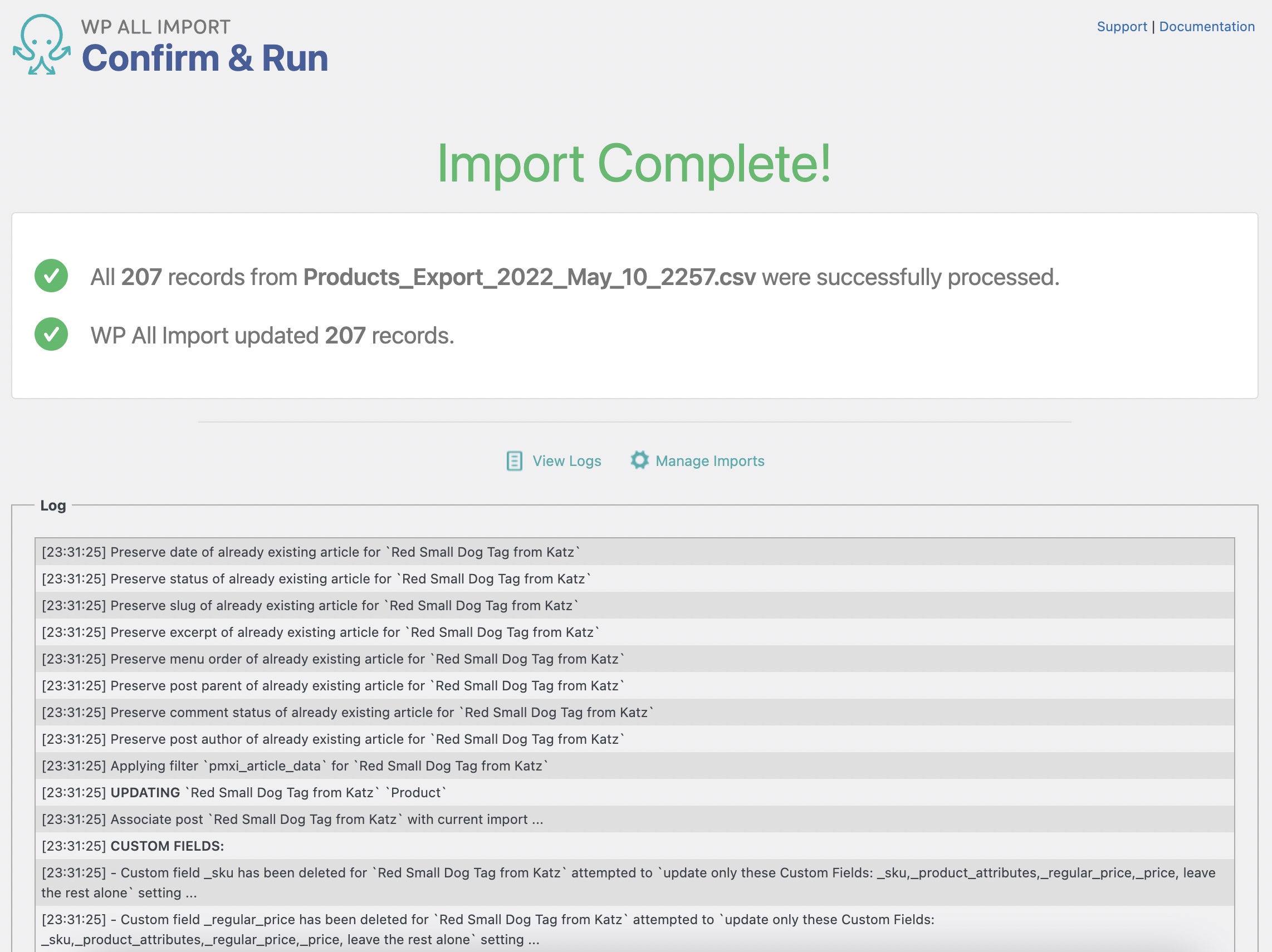 Once the import completes, you will see an Import Complete section along with a log of the changes made: