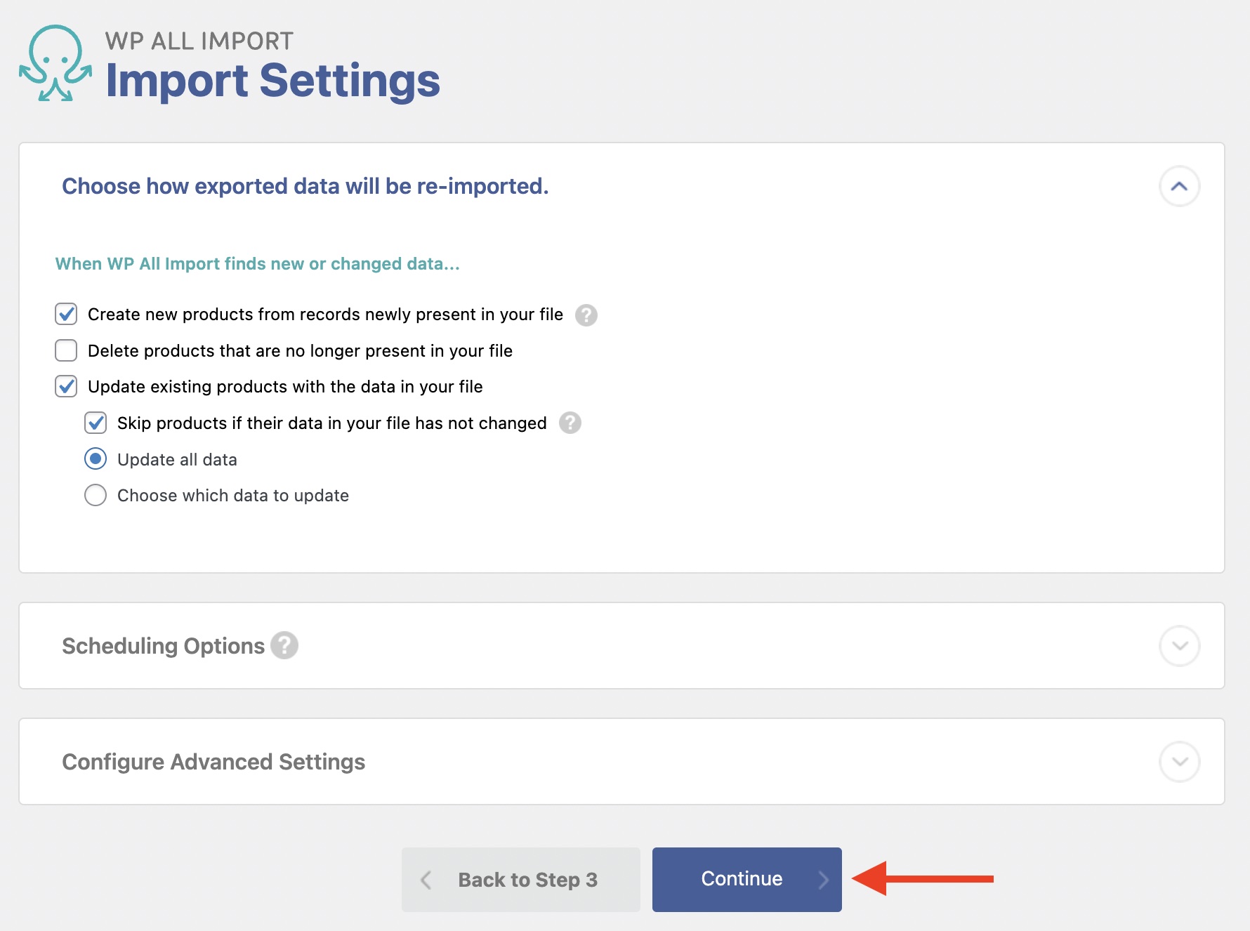 The Import Settings screen appears next. Here, you don't need to change anything, so just click Continue at the bottom of the page.