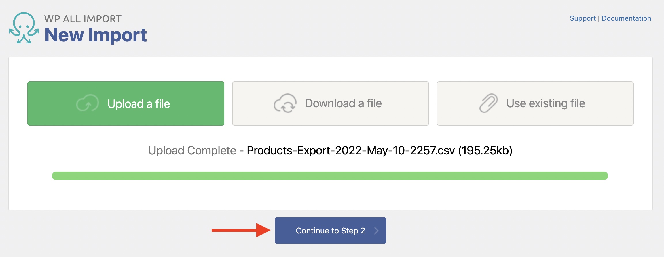 Click Continue to Step 2 after uploading the modified export file.
