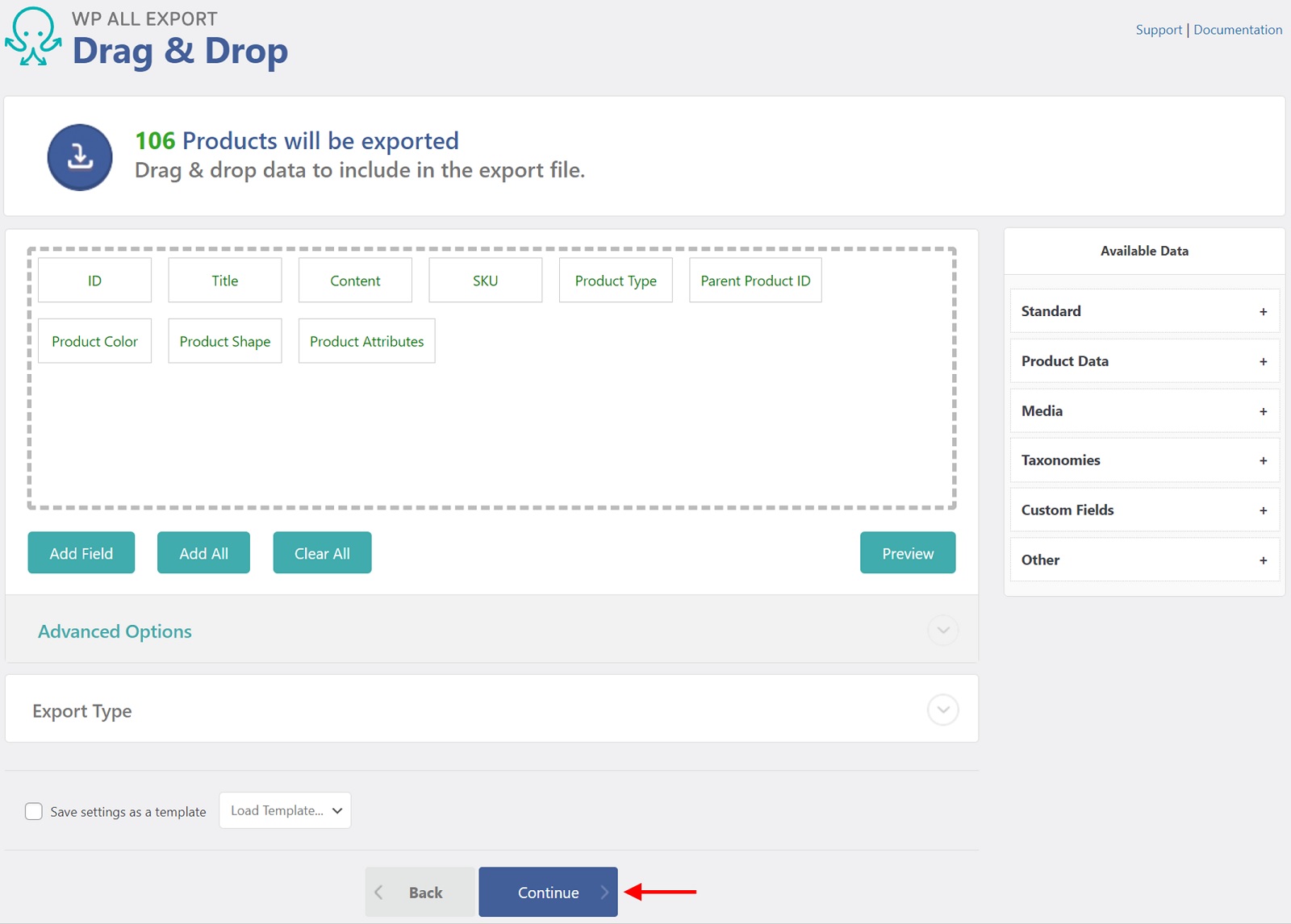 2. In the Drag & Drop screen, be sure to keep all the product attribute fields in the export layout (they are included by default).