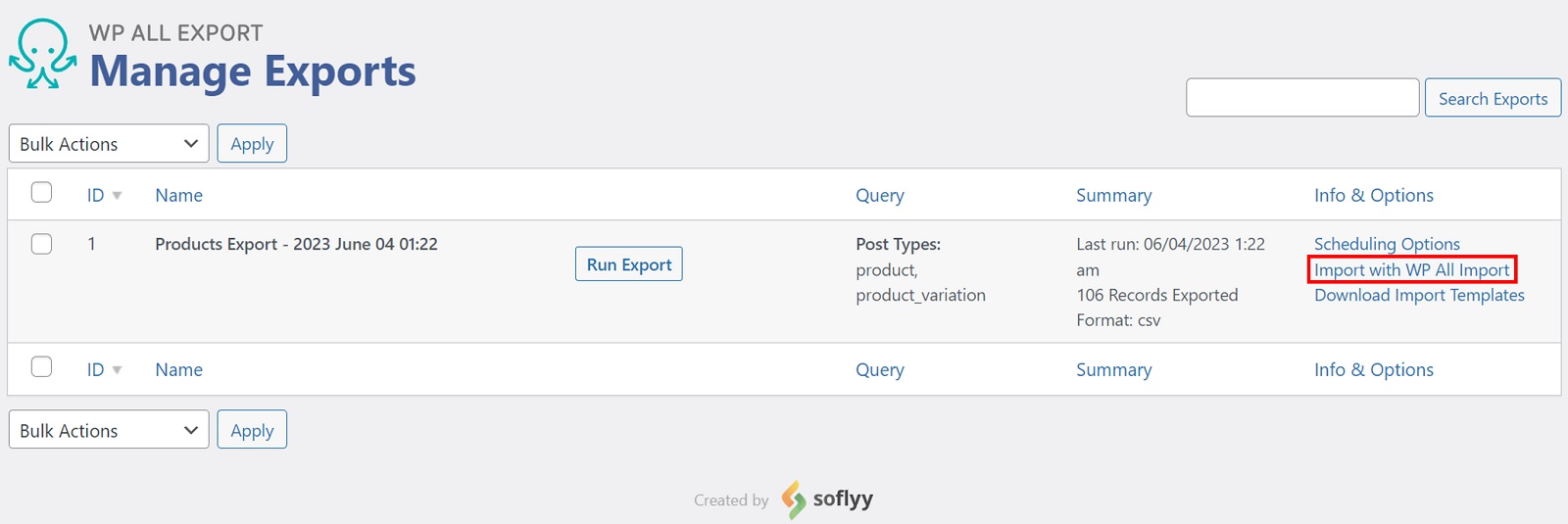 5. Import the changed data back into WooCommerce using the All Export › Manage Exports › Import with WP All Import option.