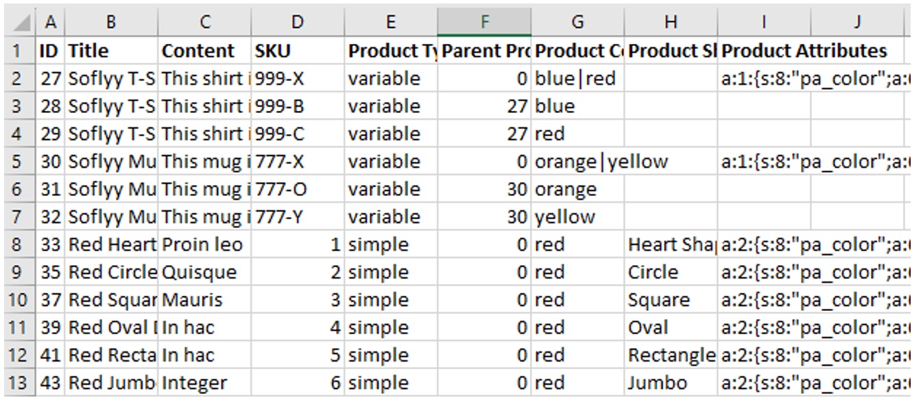 4. Edit the variations data in your favorite spreadsheet. If you are adding new variations, be sure to adhere to the required data structure. For more information on this structure, see the Attributes Tab and Variations Tab subsections of How to Import Variable Products into WooCommerce.