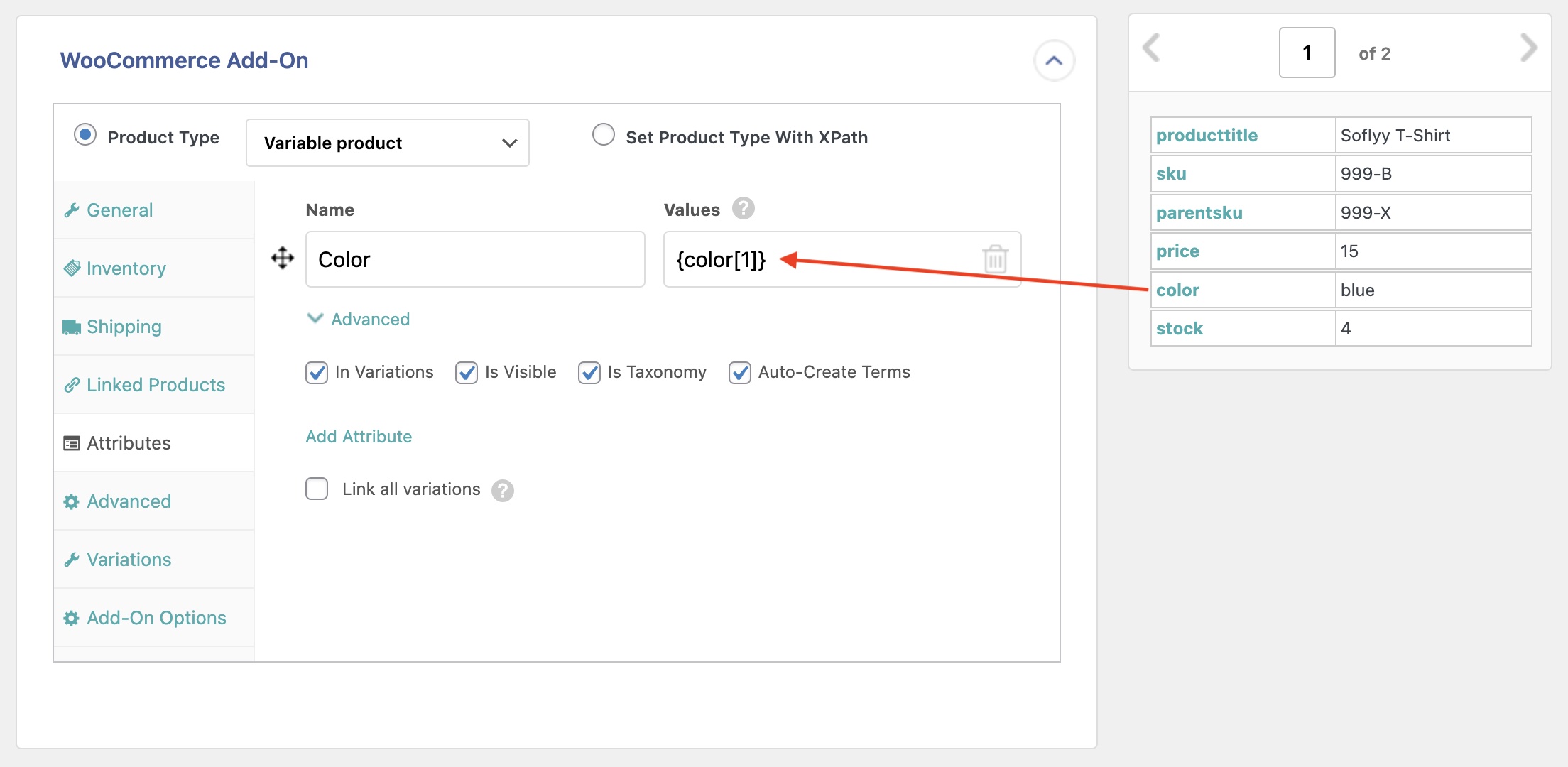 6. In the Attributes tab, map all attributes for the new variations as required.