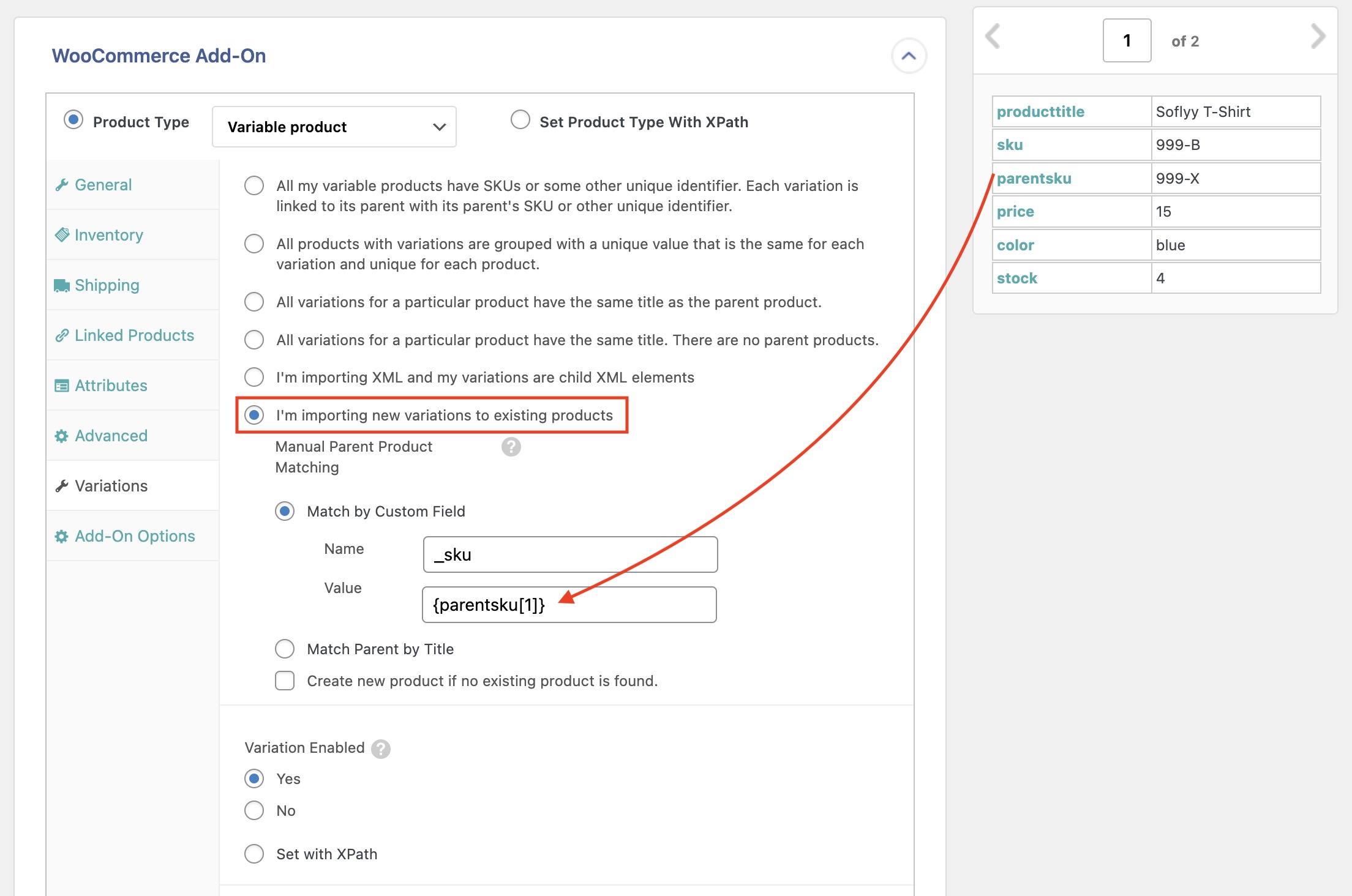 4. Also, choose Variable product as the product type and use the I'm importing new variations to existing products option in the Variations tab.