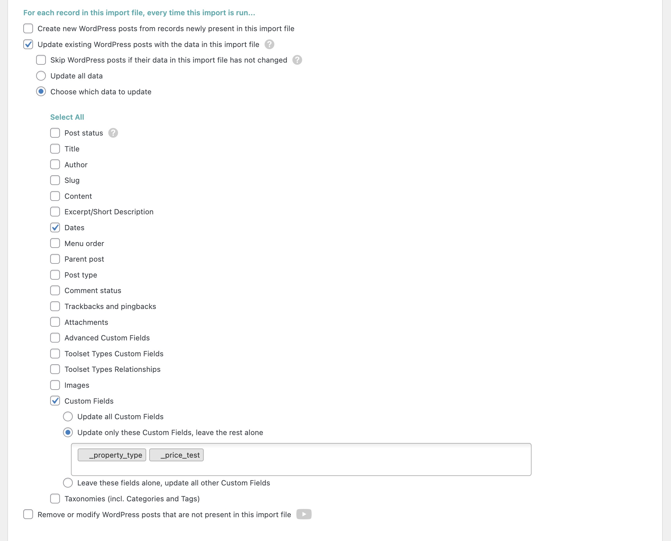 On future runs of the same import, users can choose not to update custom fields, images, and more.
