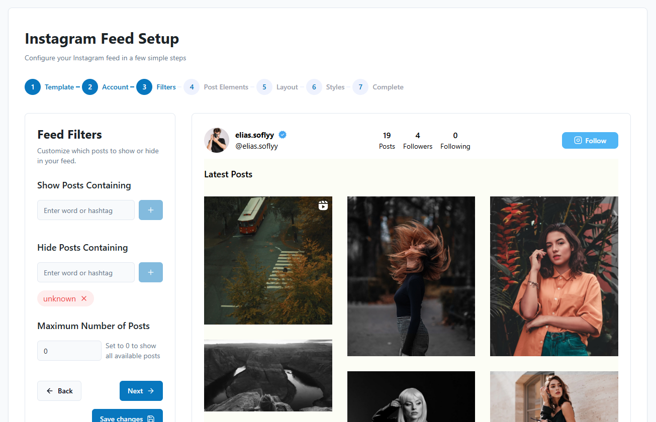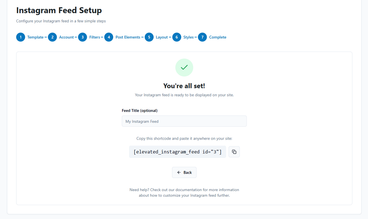 When you install Elevated Instagram Feed and open it from the WordPress navigation menu, you'll notice that a clear wizard guides you through setup. Unlike other WordPress Instagram gallery plugins that make you switch between pages to create your perfect feed, Elevated Instagram Feed keeps everything in one place.