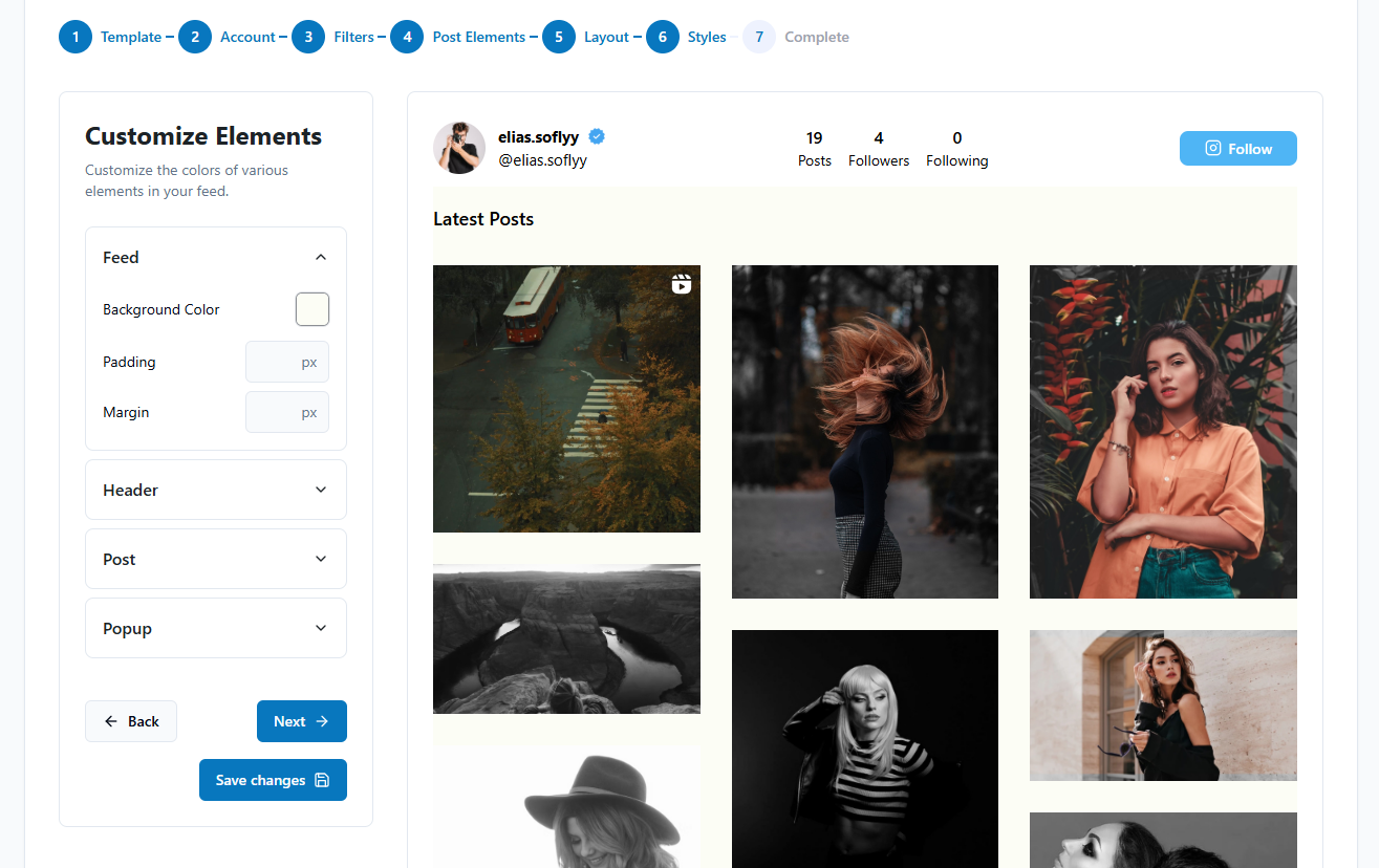 Connecting your Instagram account is straightforward. You click to authorize, log in to your Instagram Business account, and the plugin handles the rest. From there, the wizard presents each customization option in a logical flow, making it easy to follow along even if you're new to WordPress plugins. Each step builds on the previous one, so by the time you're done, your feed is ready to deploy.