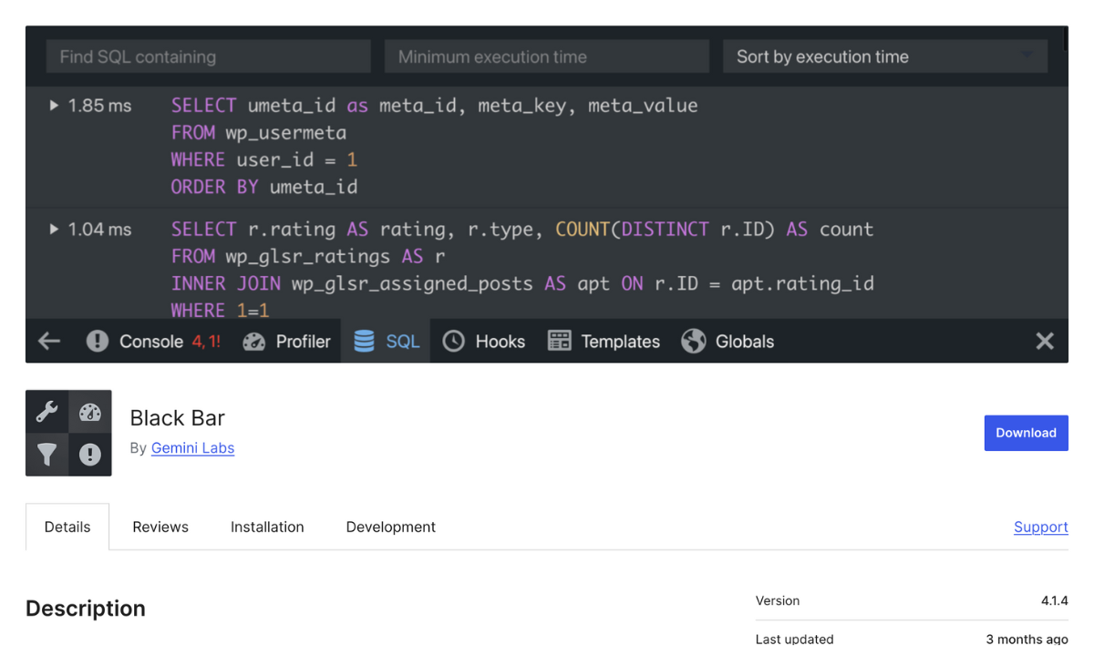 With the Black Bar plugin, you get a discreet debug bar that attaches itself to the bottom of your WordPress admin dashboard. The plugin makes WordPress development easier by collecting and displaying errors, executed SQL queries, slow actions and hooks, theme templates, and global variables.