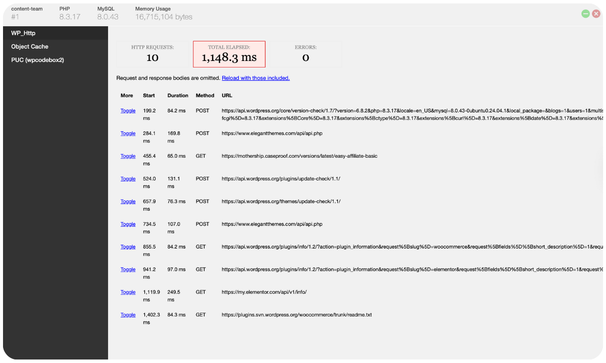 - Insights into other site details you may need to analyze and debug, including HTTP API calls, hooks and actions, database queries, memory usage, etc.