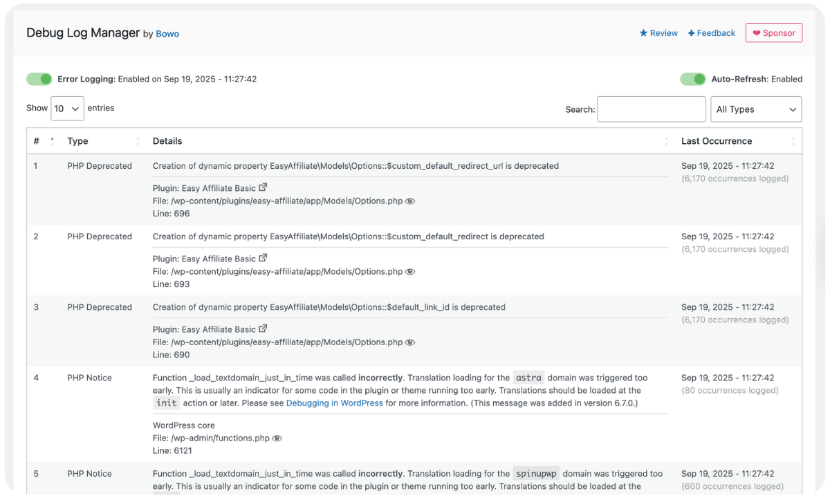 The plugin turns on debug mode with a single click from your dashboard. Once activated, it starts capturing every PHP error, warning, and notice in real-time.