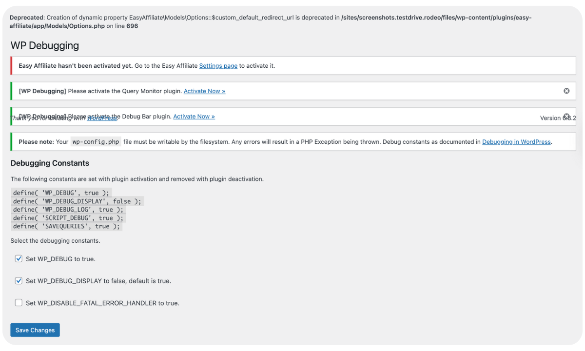 - Automatically adds built-in WordPress debug constants upon plugin activation.
