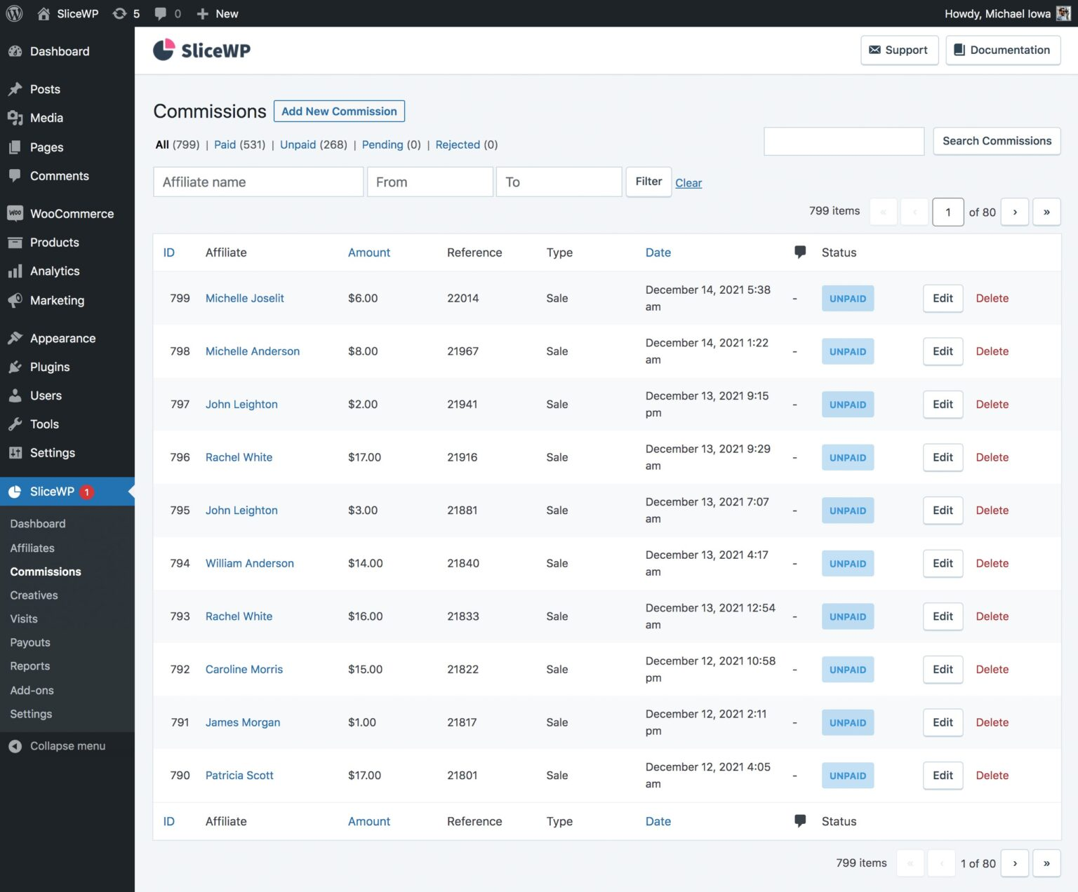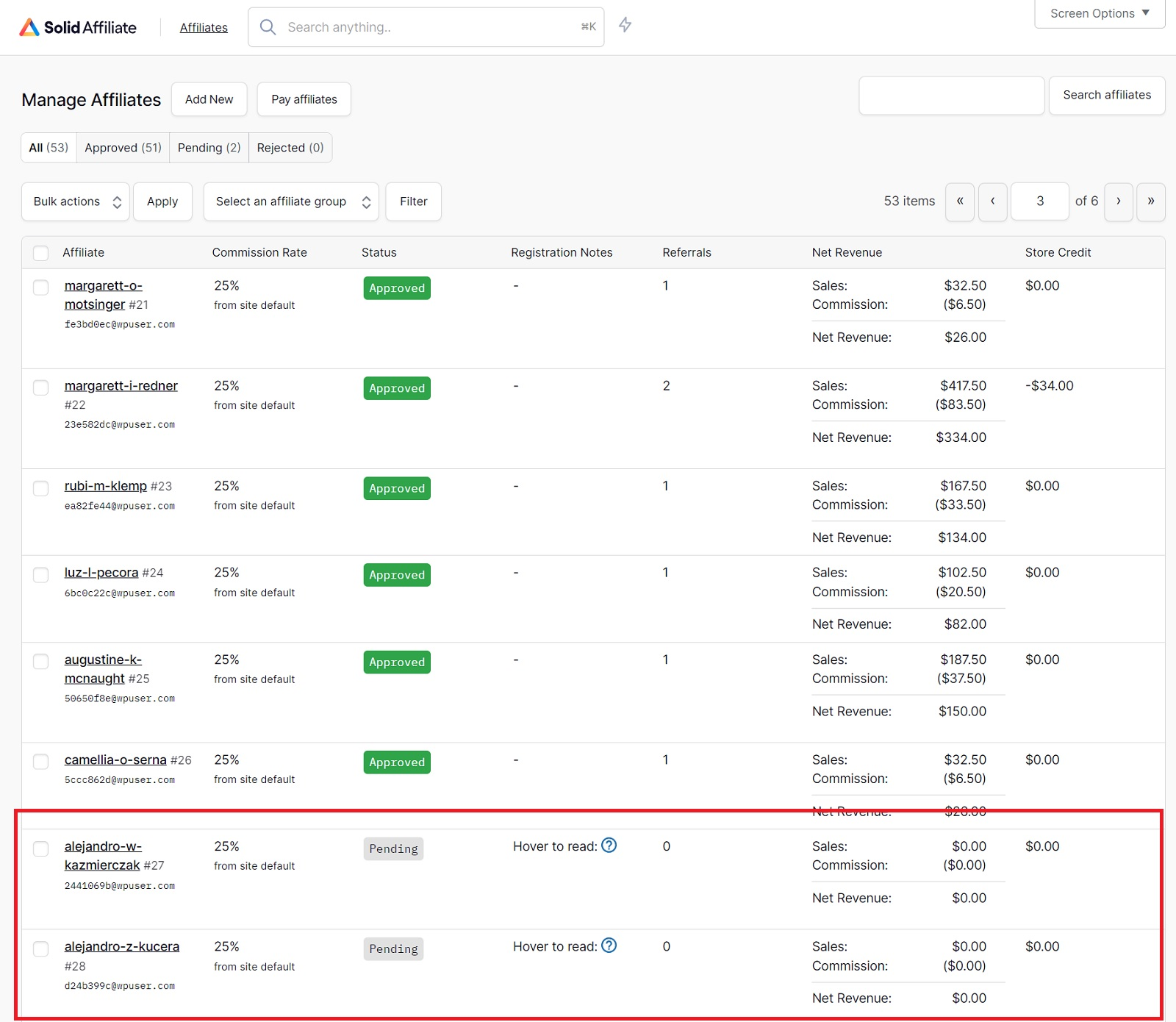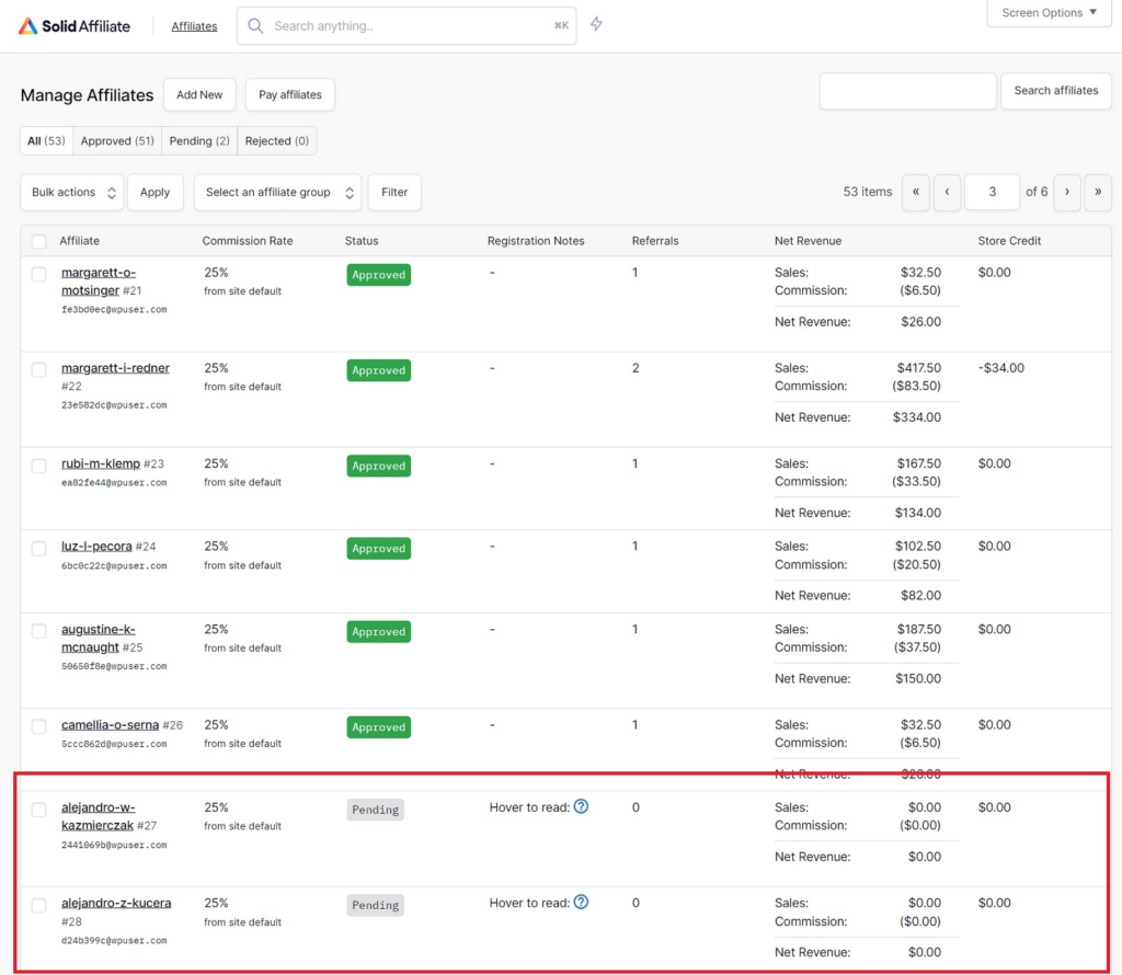 This starts with the affiliate approval process. No matter how tempting, you should not automatically approve affiliates, as that will expose you to fraud and other bad behavior. To build a quality affiliate marketing program, your plugin should provide you with a nice, clean interface where you can manually approve each affiliate that applies to your program: